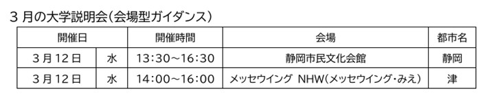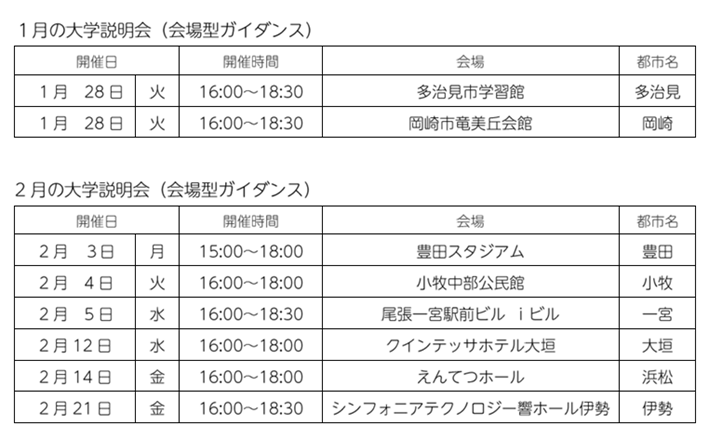 大学説明会(会場型進学ガイダンス)参加会場一覧 2025.02.15 各地で開催される大学説明会へ、教員や専門スタッフが参加し、受験生・保護者・教員の方へ、本学の案内や入試についての説明を行っています。 会場では、パンフレットや資料をお渡しして、担当者が大学や学びの特徴、キャリア支援、学納金などを詳しく説明します。進路決定等の悩みやご相談などにも丁寧にお答えします。 お近くの会場へぜひお越しください!