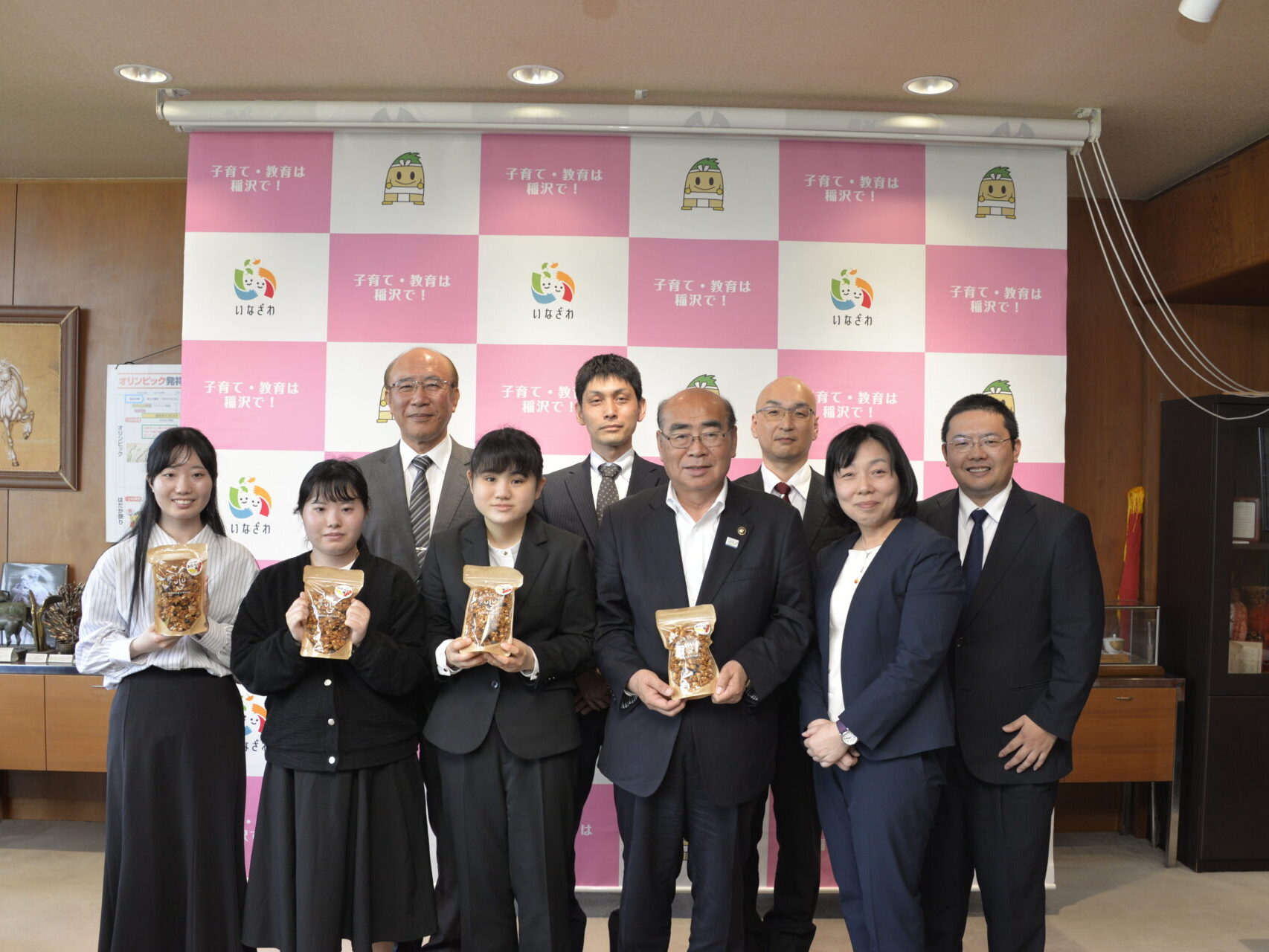 「夢みるグラノーラ 大豆グラノーラ稲沢バージョン(みたらし味)」がついに完成し、販売が開始されました。これに伴い、商品開発に携わった生活文化専攻2年の代表学生と関係者が稲沢市役所を訪問し、加藤市長を表敬訪問しました。
