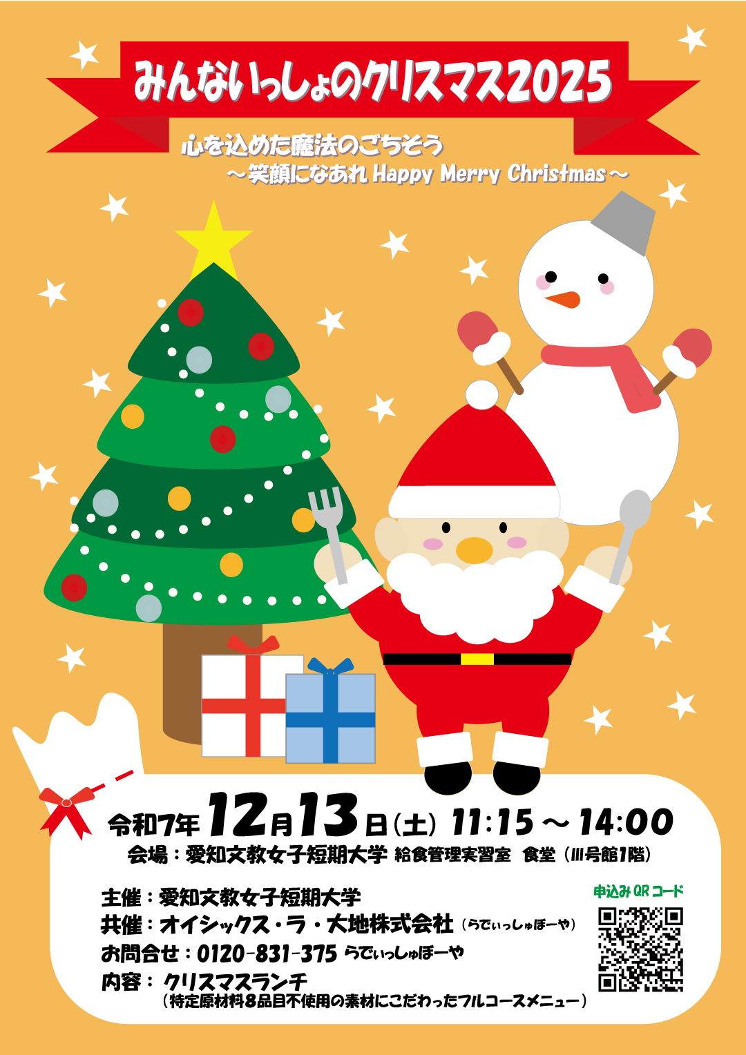 「食物アレルギーの子どもと家族に、安心して食事を楽しむ時間を届けたい」という思いから、2003年より毎年開催している愛知文教女子短期大学ならではのイベント「みんないっしょのクリスマス」。学生たちが特定原材料8品目を使わずに考案したフルコース料理を提供し、これまでに1000名以上のご家族をお迎えしてきました。調理・接客は食物栄養専攻、ポスターやプログラム制作は生活文化専攻が担当。学生オリジナルのクリスマスポストカードも毎年大好評です。「みんないっしょ」に同じ料理を楽しめる特別なクリスマス。今年も笑顔あふれる幸せ時間をお届けします!