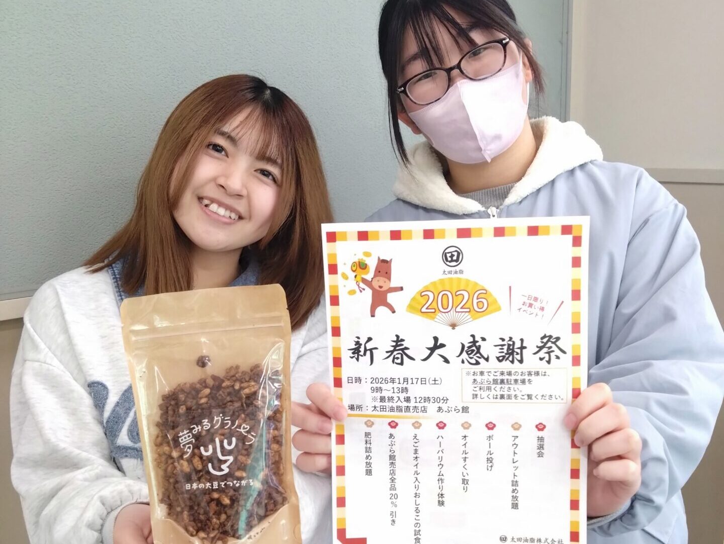 生活文化専攻の学生が、企業と福祉施設と連携して開発したオリジナル商品『大豆グラノーラ「味噌ココア味」』 が、2026年1月17日(土)9:00〜13:00(最終入場12:30) に開催される太田油脂株式会社 あぶら館(愛知県岡崎市)新春感謝祭 で初めて販売されます。