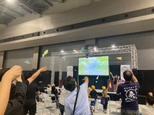 ステージのラストでは、参加者全員で紙飛行機を折り、スクリーンの青空に向かって未来への想いを込めて飛ばしました。会場全体が一体となり、心が温まる時間になりました。
