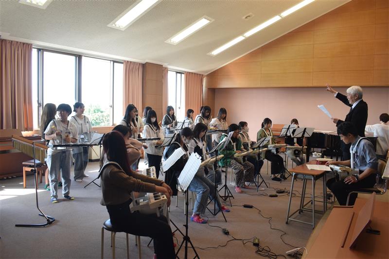 幼児教育学科では、子どもの豊かな感性を育むため、セントラル愛知交響楽団の山本雅士先生から音楽表現の指導方法を学んでいます。 今回、3部3年の学生たちが実際に幼児保育の現場でも使用されているキーボード、鉄琴、小太鼓、大太鼓、タムタムなどの楽器を使って、マーチング演奏を披露しました。