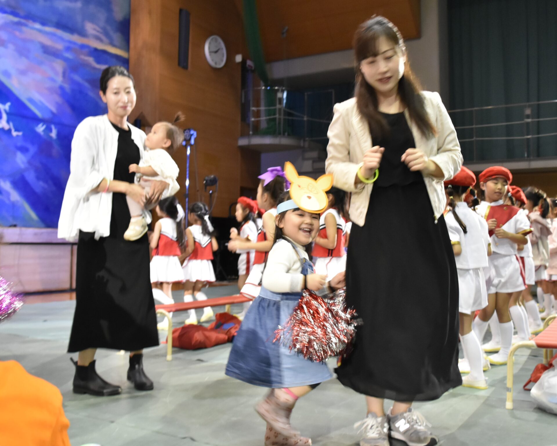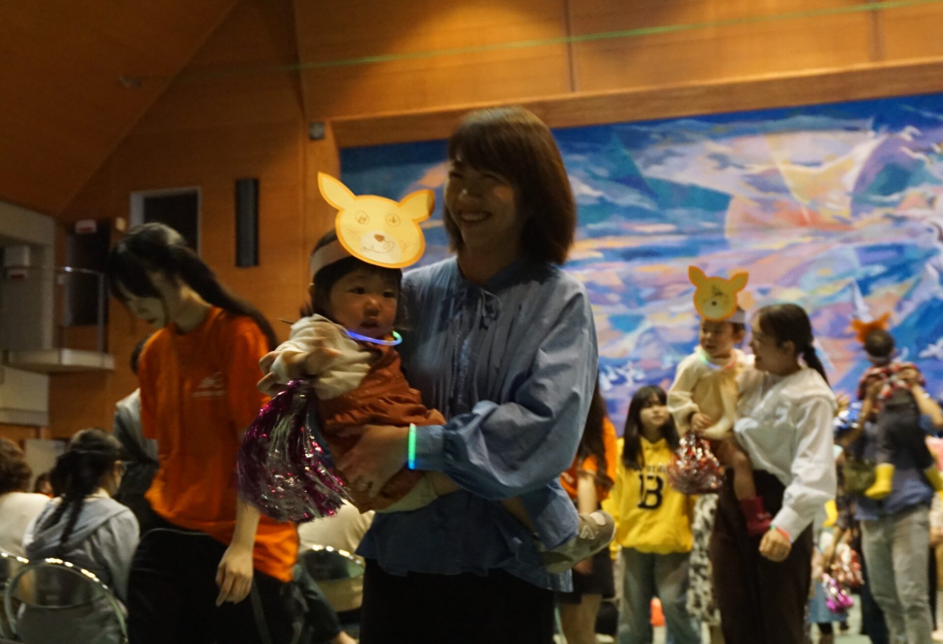 『カンガルンバ』は、日ごろの活動で親しんでいるダンスということもあり、文教おやこ園の小さな子どもたちも、たくさんのお客さんの前で、元気に可愛く踊ることができました。幼児教育学科の学生である「カンガルンバのお姉さん」も子どもたちと楽しくダンスをして盛り上げてくれました。