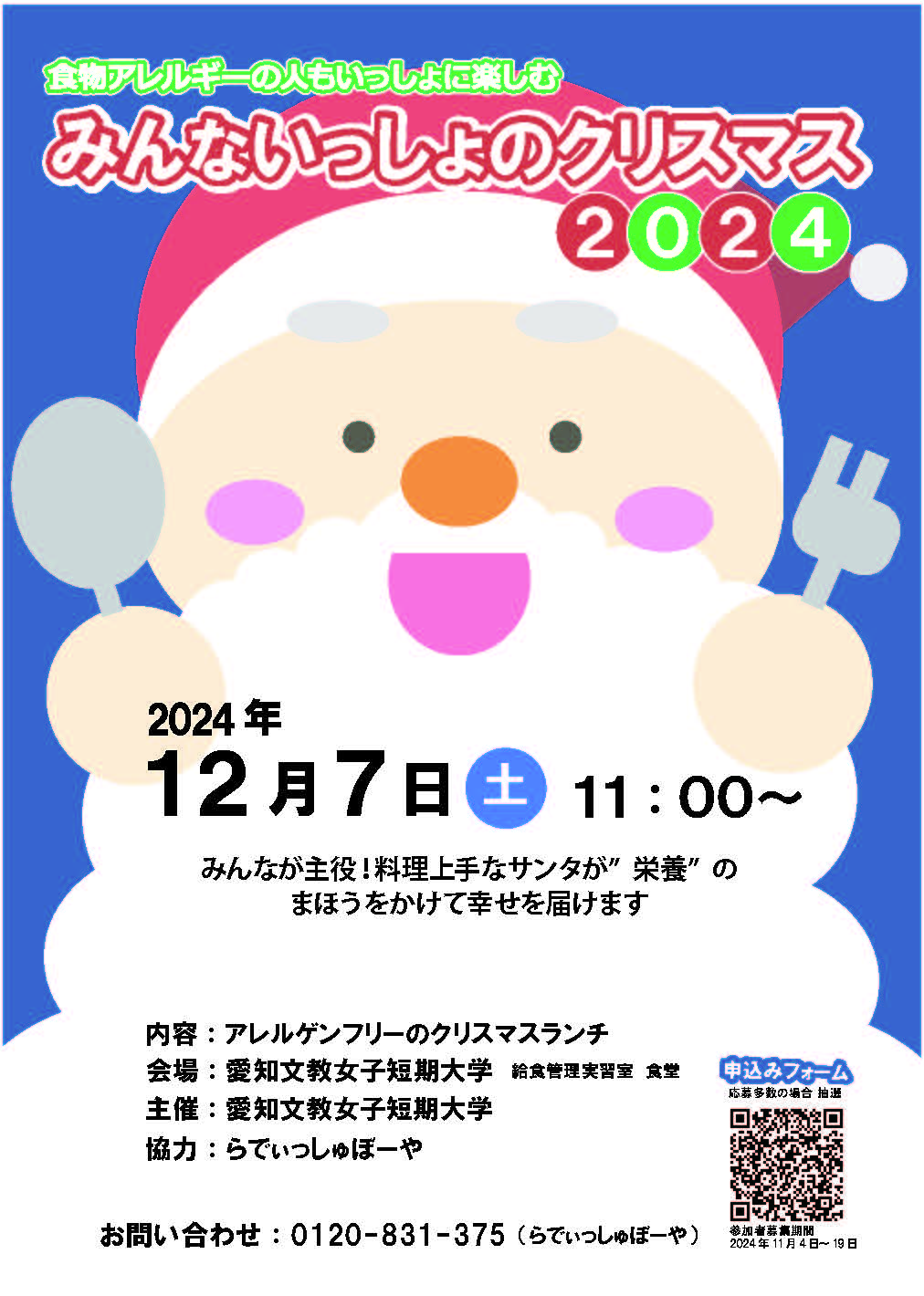 食物アレルギーのある子どもとその家族にとって、まだまだ外食は難しい状況です。アレルゲンの混入リスクや、対応可能な店舗でも完全に安心できるわけではなく、保護者は常に不安を抱えていることが少なくありません。「みんないっしょのクリスマス」では、そうした不安を取り除き、みんなが同じ料理を楽しむことができるようにと、2003年より愛知文教女子短期大学の学生たちが中心となって企画・運営しています。