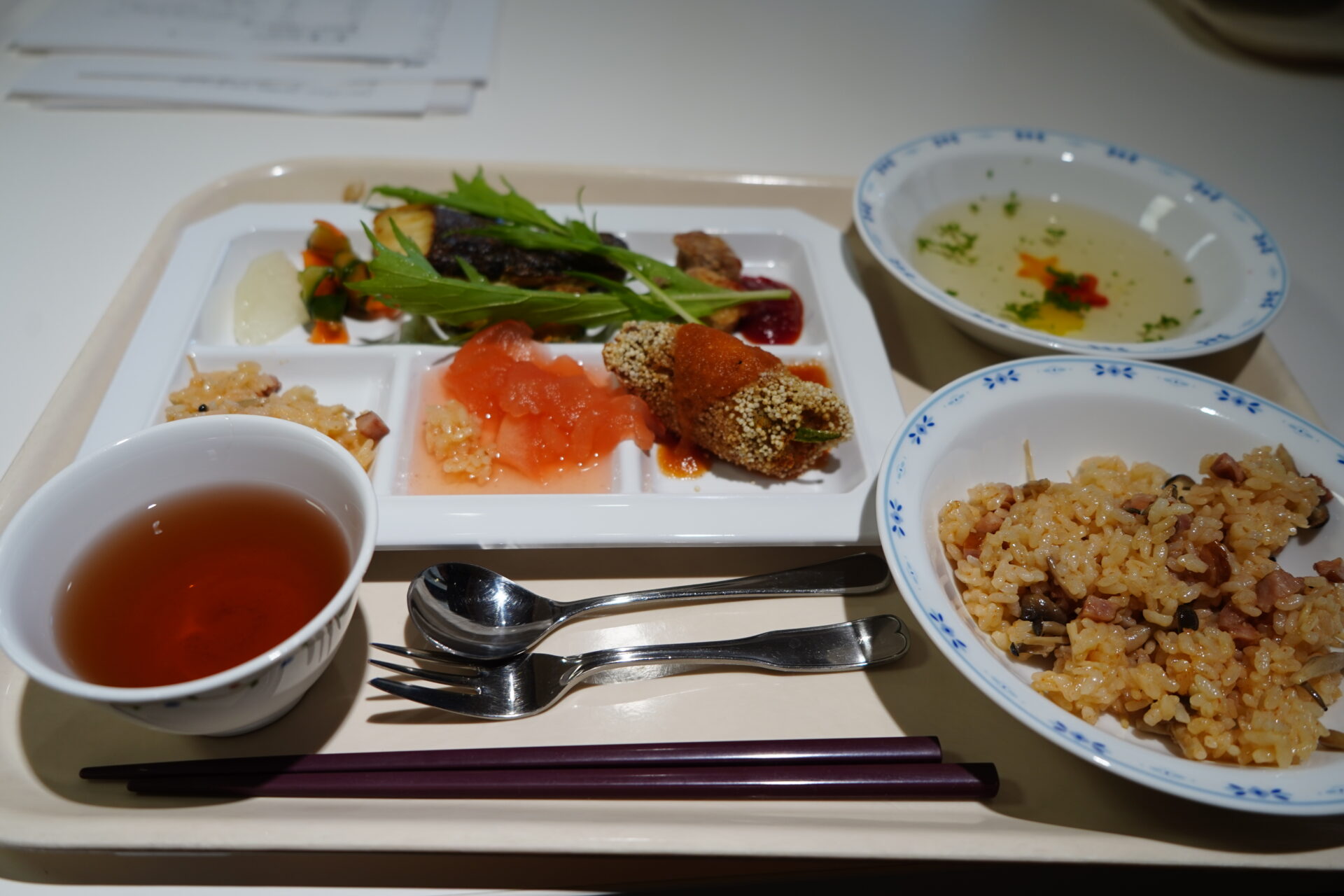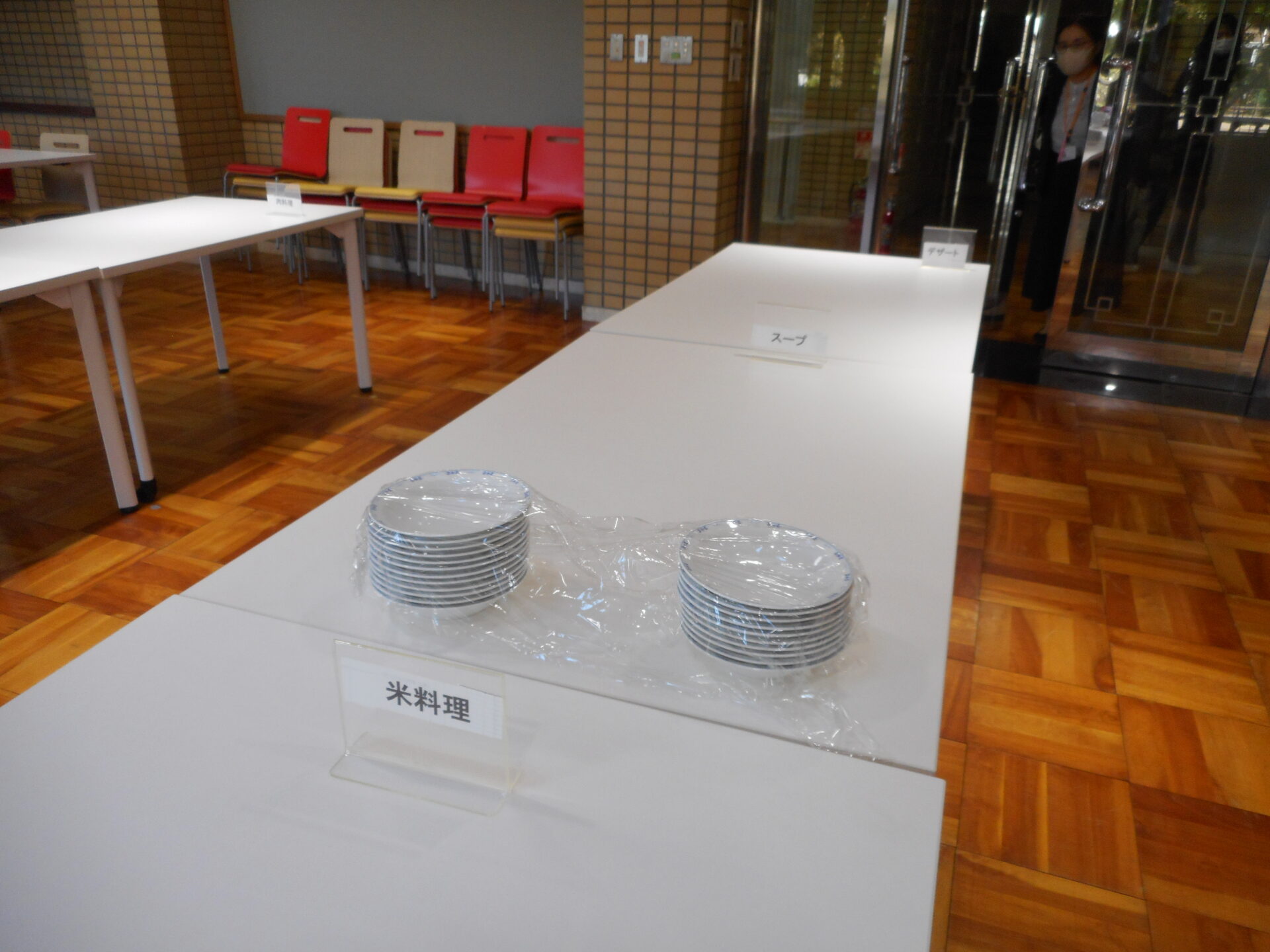 調理後は、全員で試食。料理の配置にも混雑しないような工夫をし、ビュッフェ形式で全員が試食しました。試食は和やかな雰囲気で、参加者全員が料理の感想をシェアし合い、改善点なども話し合いました。臨床栄養学実習や食物アレルギーの授業で学んだアレルギー対応の知識や、給食管理実習で学んだ大量調理や提供の方法を活かして、安全にパーティーを成功させるためにはどうすれば良いか話し合います。料理の配置方法やフルサービスの進行をスムーズに行うため、学生の動線や役割分担を考慮し、全員で協力して効率的なサービスができるように計画を立てていきます。