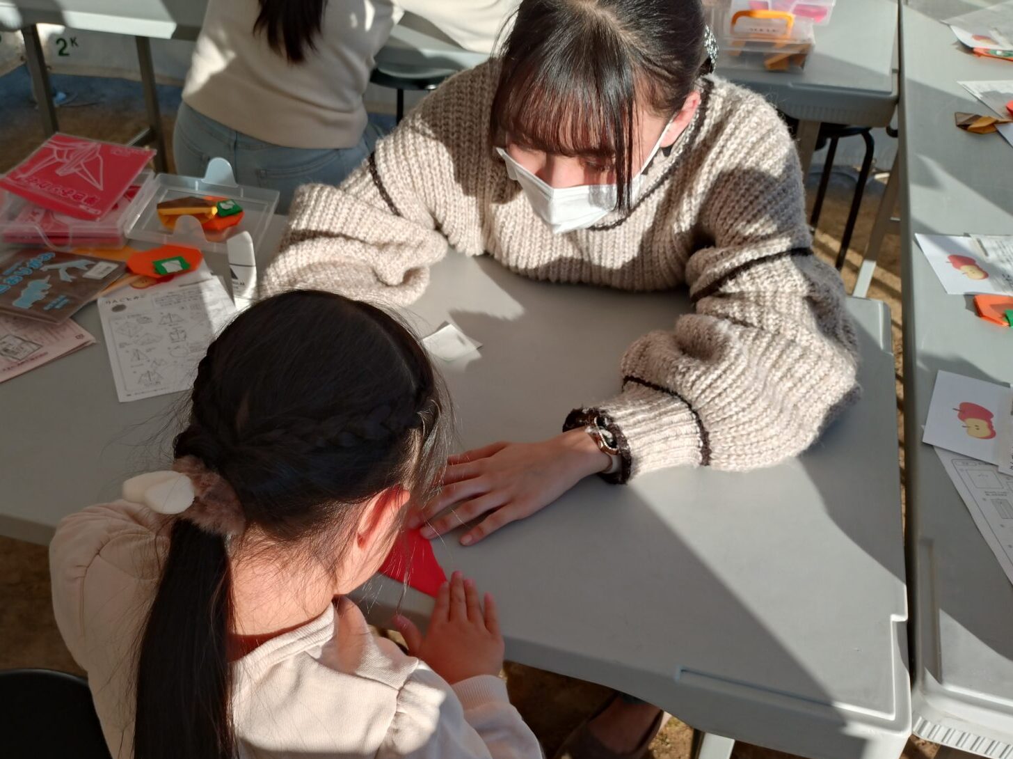 毎年恒例となった「食育おりがみ体験」のブースでは、食材をモチーフにした折り紙の作り方を教え、完成した折り紙作品を通して「食の大切さ」を伝えます。食育おりがみをどう教えたらわかりやすいのか、また、どうやったら食に興味をもってもらえるのかを考え準備を進めました。ブースは、たくさんのこともたちで大盛況。学生たちも参加してくれた方の笑顔に元気をもらいました。