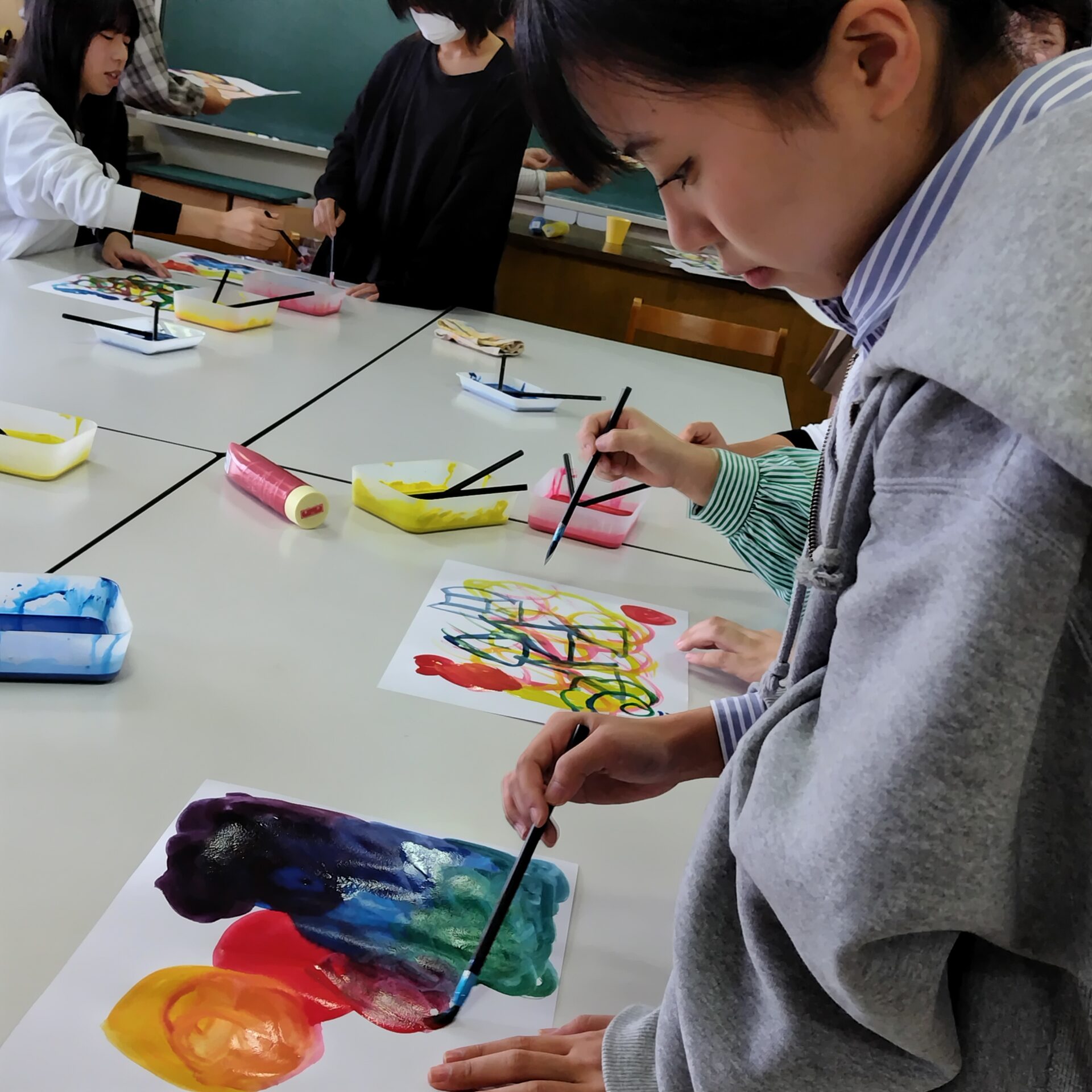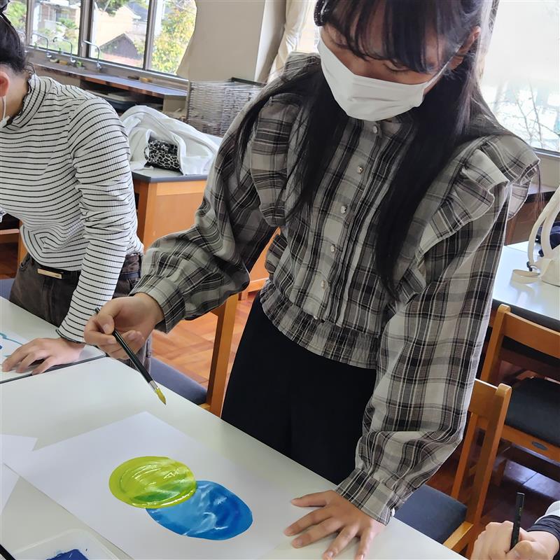 赤・青・黄の3色のみで描画表現を楽しむ授業では、紙の上で色を混ぜ、色の不思議さに心を動かします。色が混ざり合うと、3色だけとは思えない様々な色の世界が広がります。