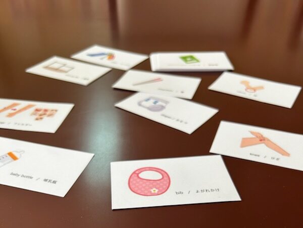 授業で活用される図書館が手作りした「英語かるた」を使った授業は、保育に関連する単語を楽しく覚えられる工夫が満載です。たとえば、おむつ(diaper)やよだれかけ(bib)など、乳幼児に関わる単語をゲーム感覚で覚えられるので、実践的な語彙力を身につけることができます。