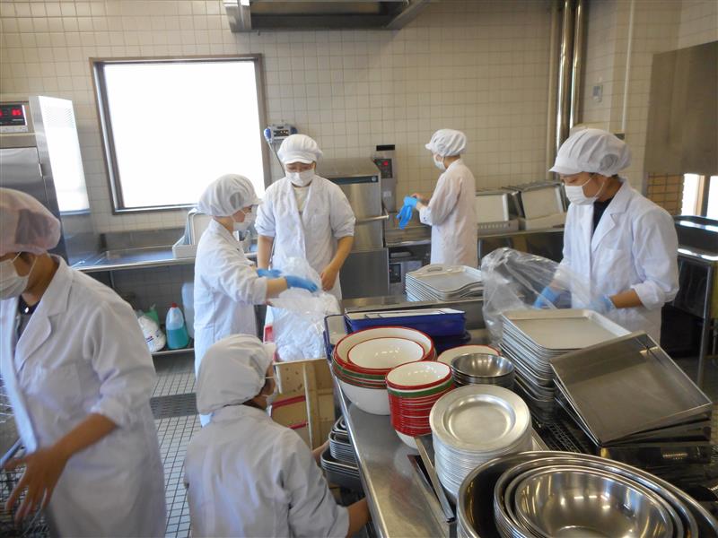 安全なパーティを実施する為に、まず、使用するスペースの清掃から始まります。実習で使用する厨房は、普段小麦・乳・卵を使用しているため器具等に付着している可能性があります。混入を防ぐためにパーティの一週間前に厨房内を入念に清掃します。パーティー会場もクリスマスムードたっぷりに飾り付け、実行委員の学生が清掃箇所の確認など、最終チェックを行います。