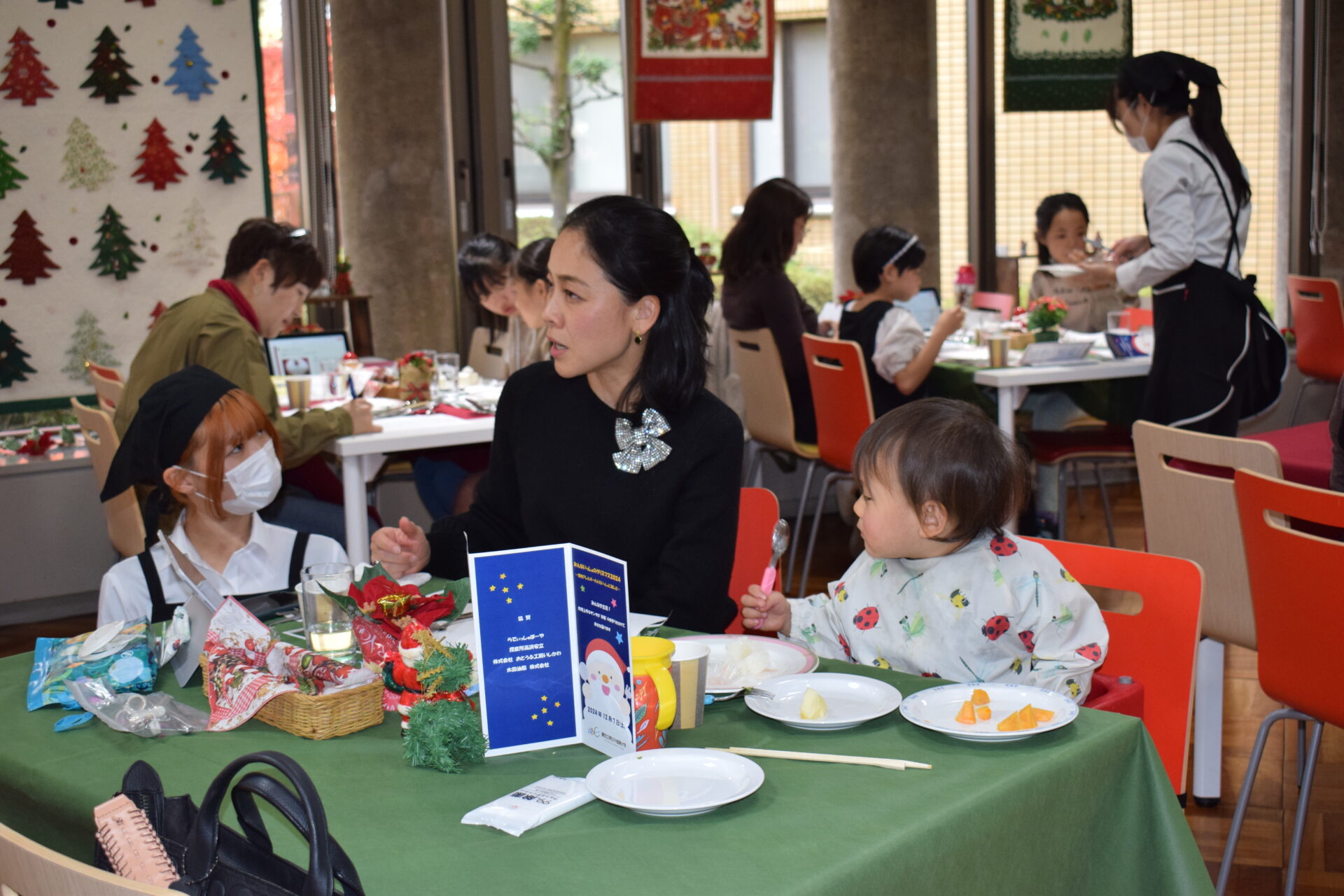 パーティの最後は、全員がホールに並び参加者へ挨拶をしました。たのしい雰囲気のクリスマスパーティーに、「全部食べることができたよ!」「おいしいね!」と、うれしそうな笑顔の親子たちの姿。学生たちも達成感を感じていました。