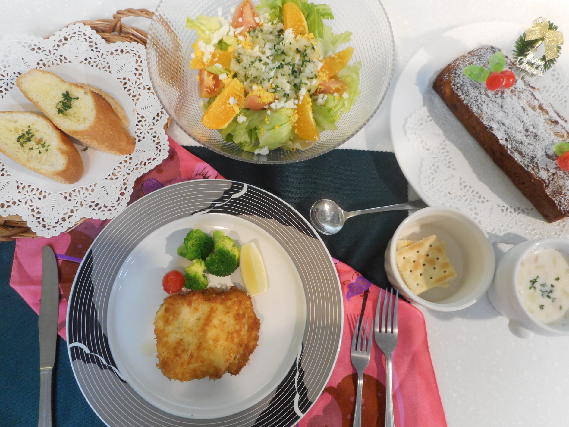 1年後期に開講される「調理学実習Ⅱ」の授業では、西洋料理と中国料理を学びます。今回の実習では、日常のメニューに工夫を加えてクリスマスディナーを作りました。メニューは、チキンカツレツ、ミモザサラダ、クラムチャウダー、ガーリックトースト、パウンドケーキです。