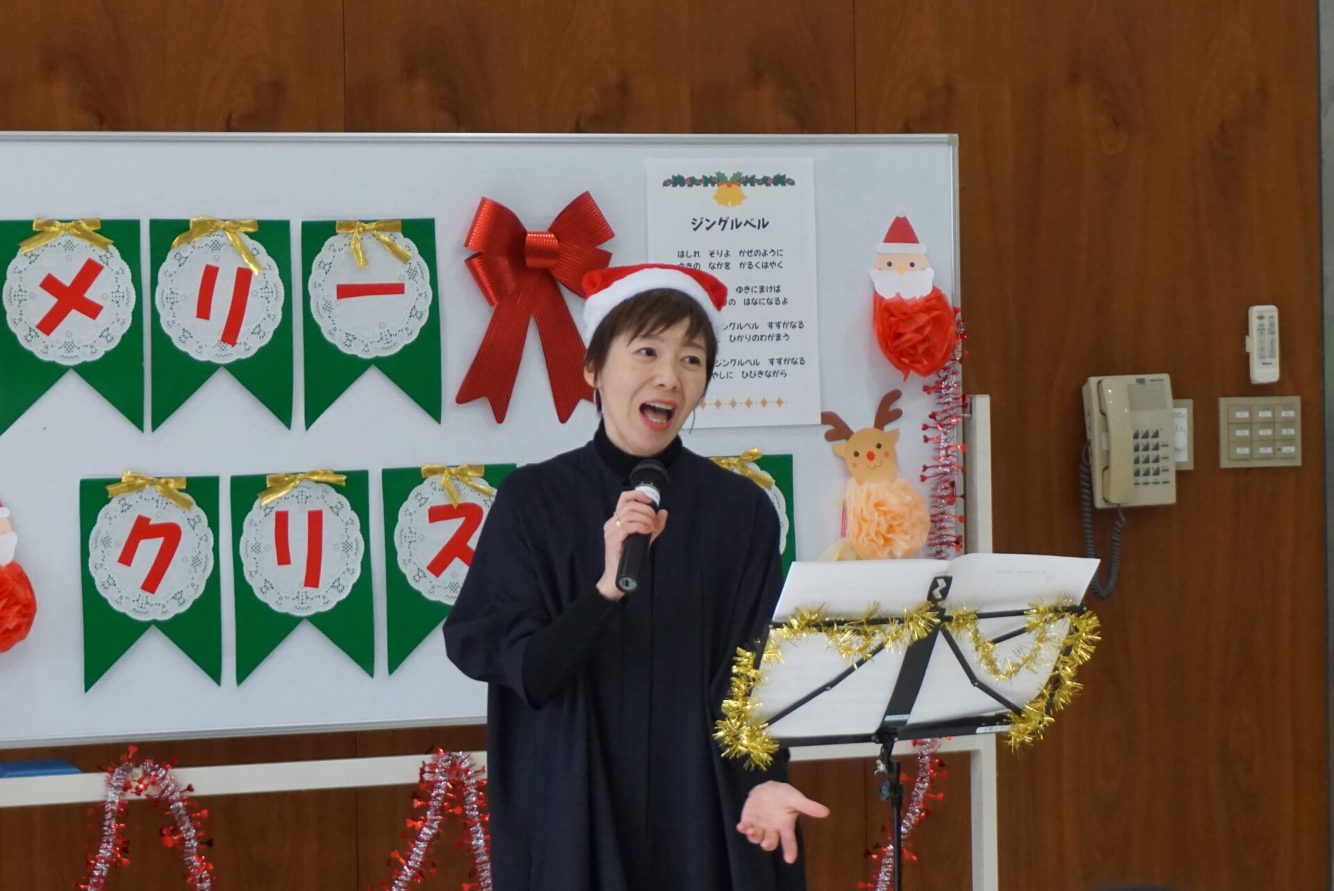 サンタ姿の玉田先生のピアノ演奏と国藤先生の歌がクリスマスの雰囲気を盛り上げます。