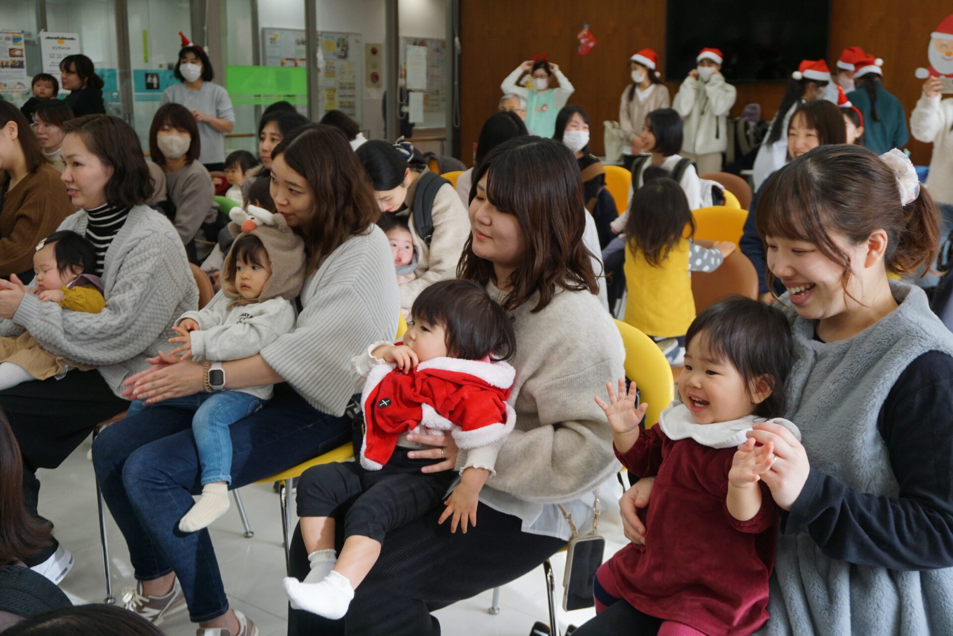 「文教おやこ園」からは、約40組の親子がコンサートに参加し、2名のママがピアノとフルートの演奏を披露してくださいました。サンタクロースやトナカイなどの衣装を着たかわいい子どもたちの姿や、音楽に合わせて体を動かしながら音やリズムを楽しむ子どもの様子が見られ、文教女子らしい温かな雰囲気のクリスマスコンサートとなりました。