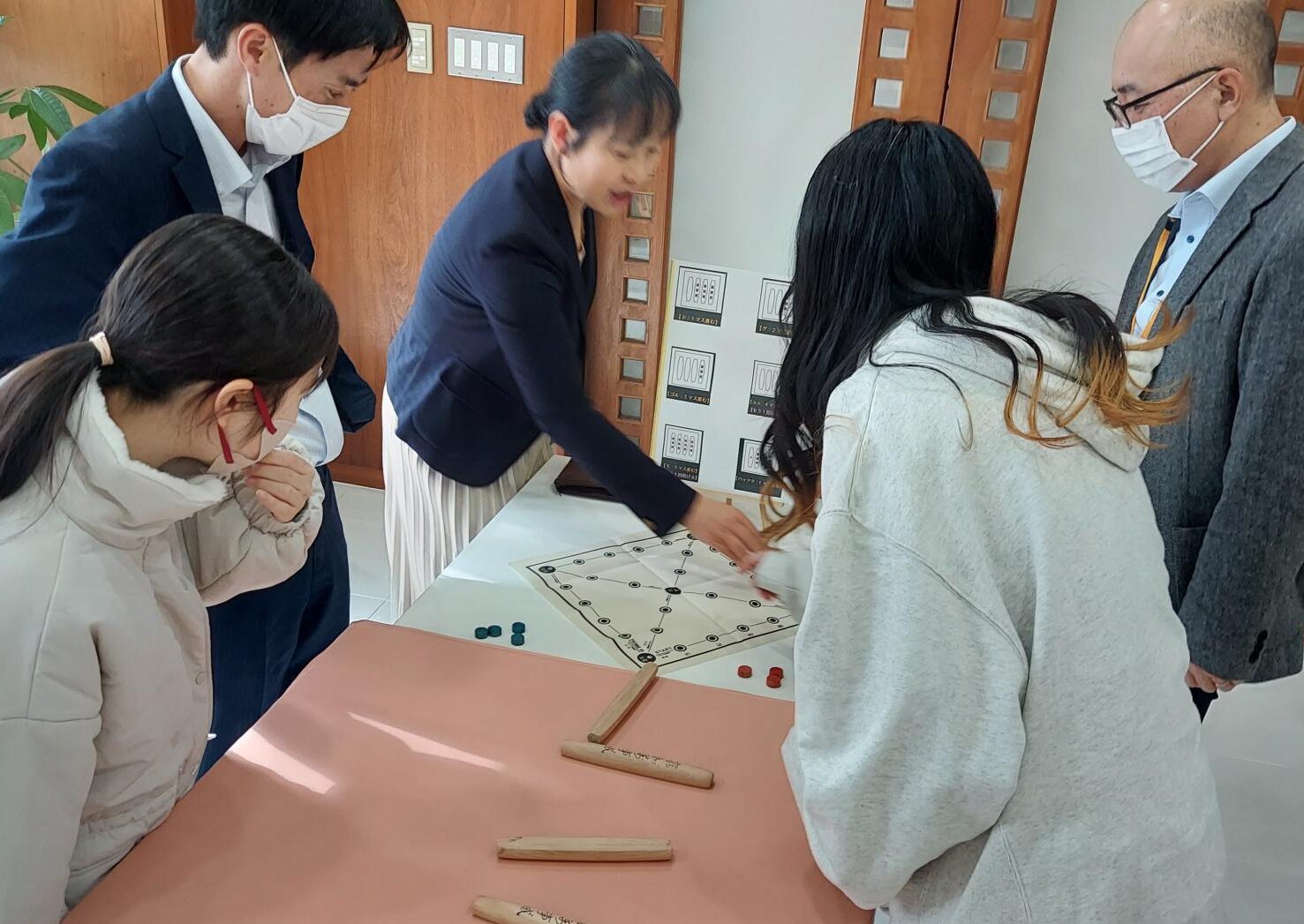 4本の「ユ」という棒を投げ、出た目の分だけコマを進めます。カランカランと鳴る棒の音が心地よい遊びです。簡単に楽しめるルールなので、初めて体験する学生もすぐに理解できました。
