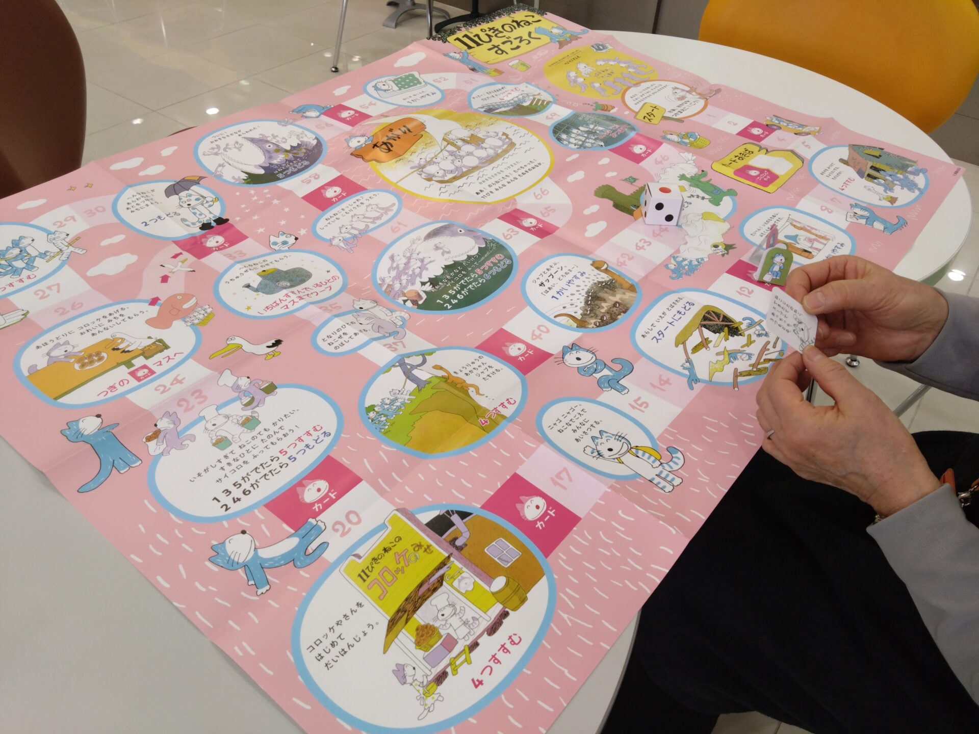 「11ぴきのねこ」すごろくは、「あほうどりにコロッケをあげる」「ねんねこさっしゃれ♪の子守唄を歌う」など絵本の世界を楽しみました。
