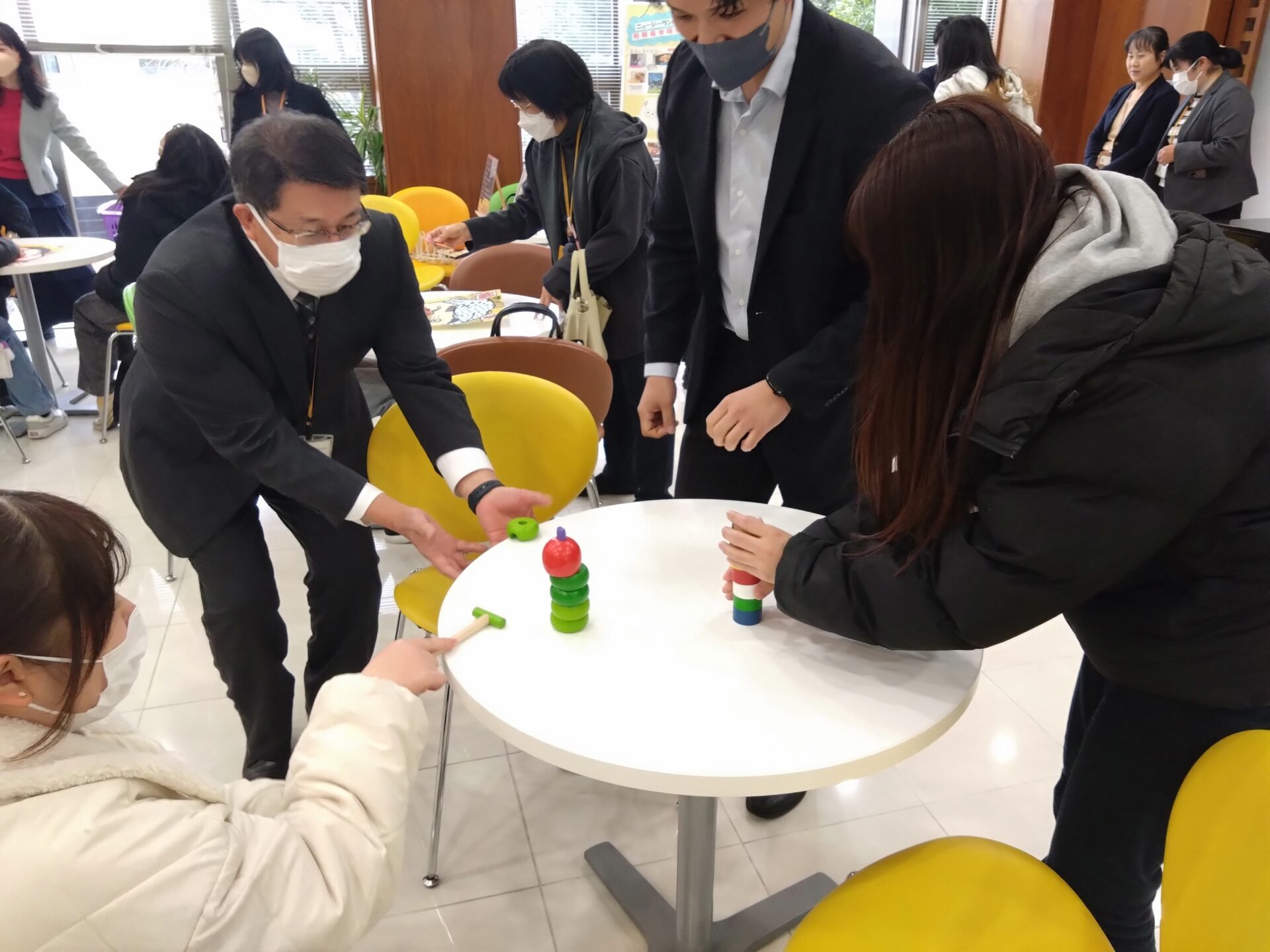 だるま落としは、「やりたい!」という学生たちで盛り上がりました。全部上手に落とせると、大きな歓声が上がりました。