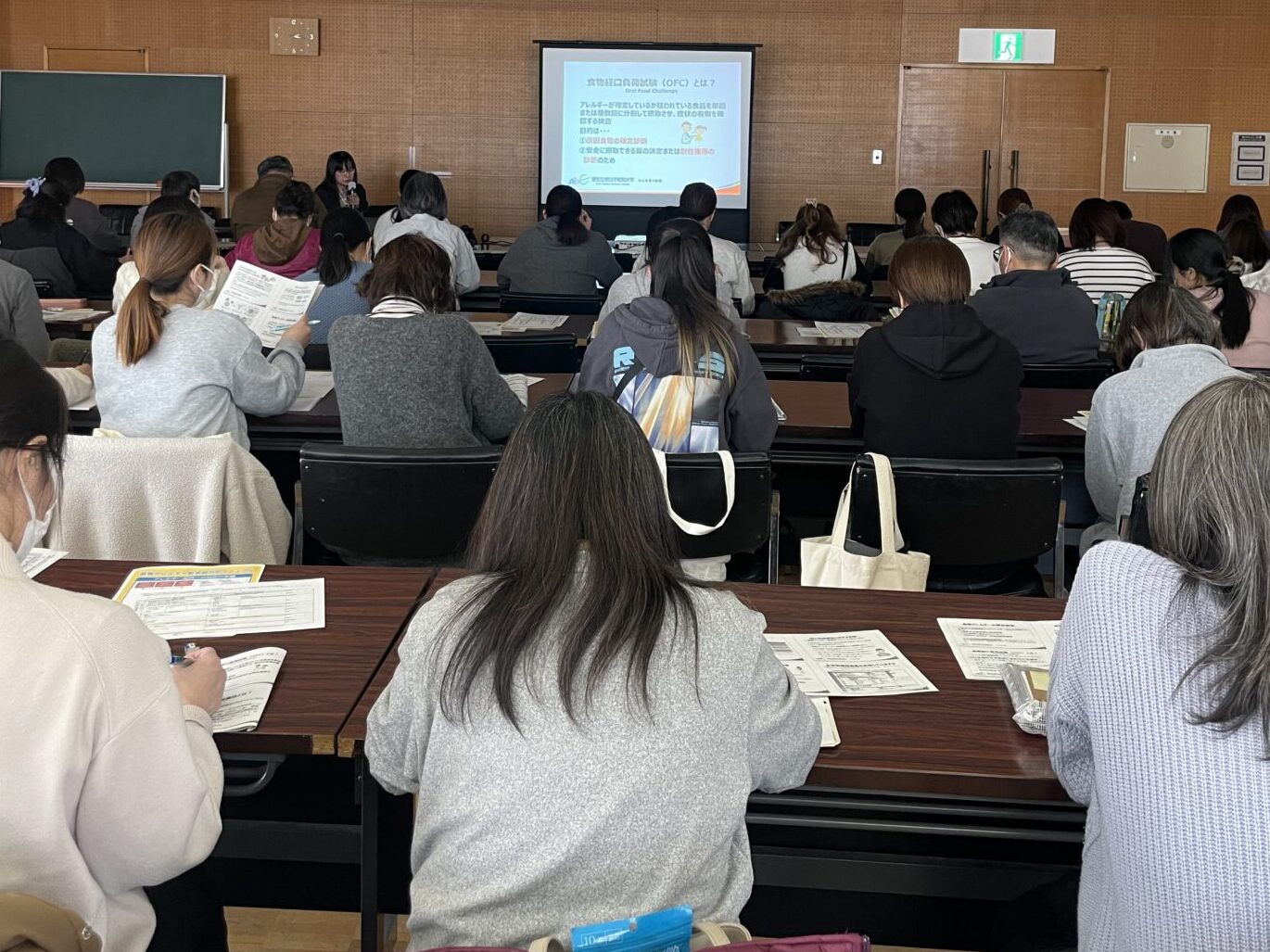 この研修会は、稲沢市子ども健康部保育課が主催し、公立保育園の保育士や学童保育の指導員の方々が参加されました。定員40名のところ、なんと50名もの参加があり、食物アレルギーへの関心の高さがうかがえました。