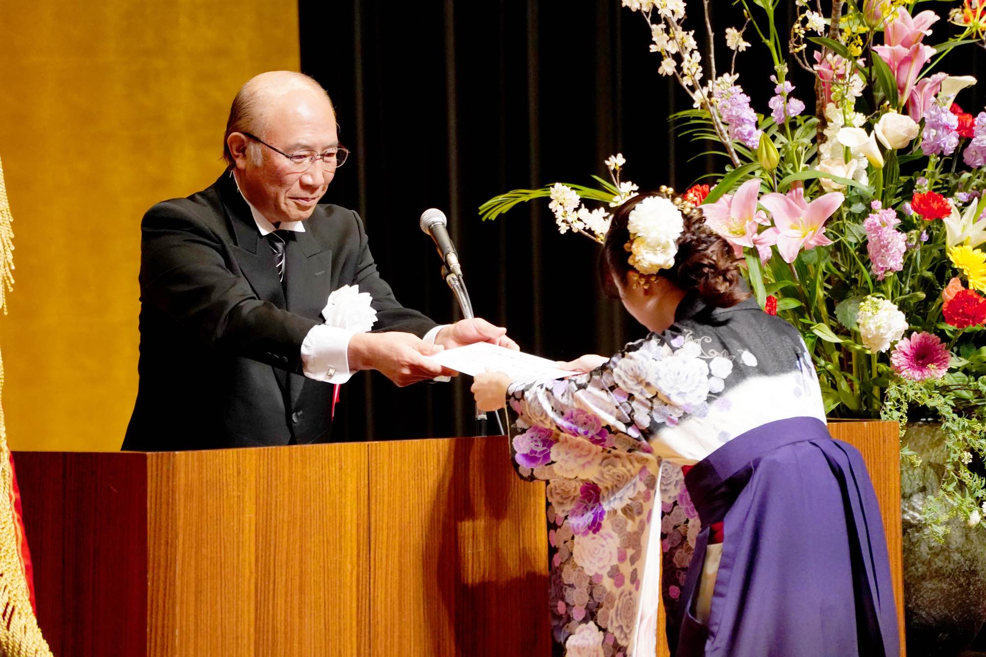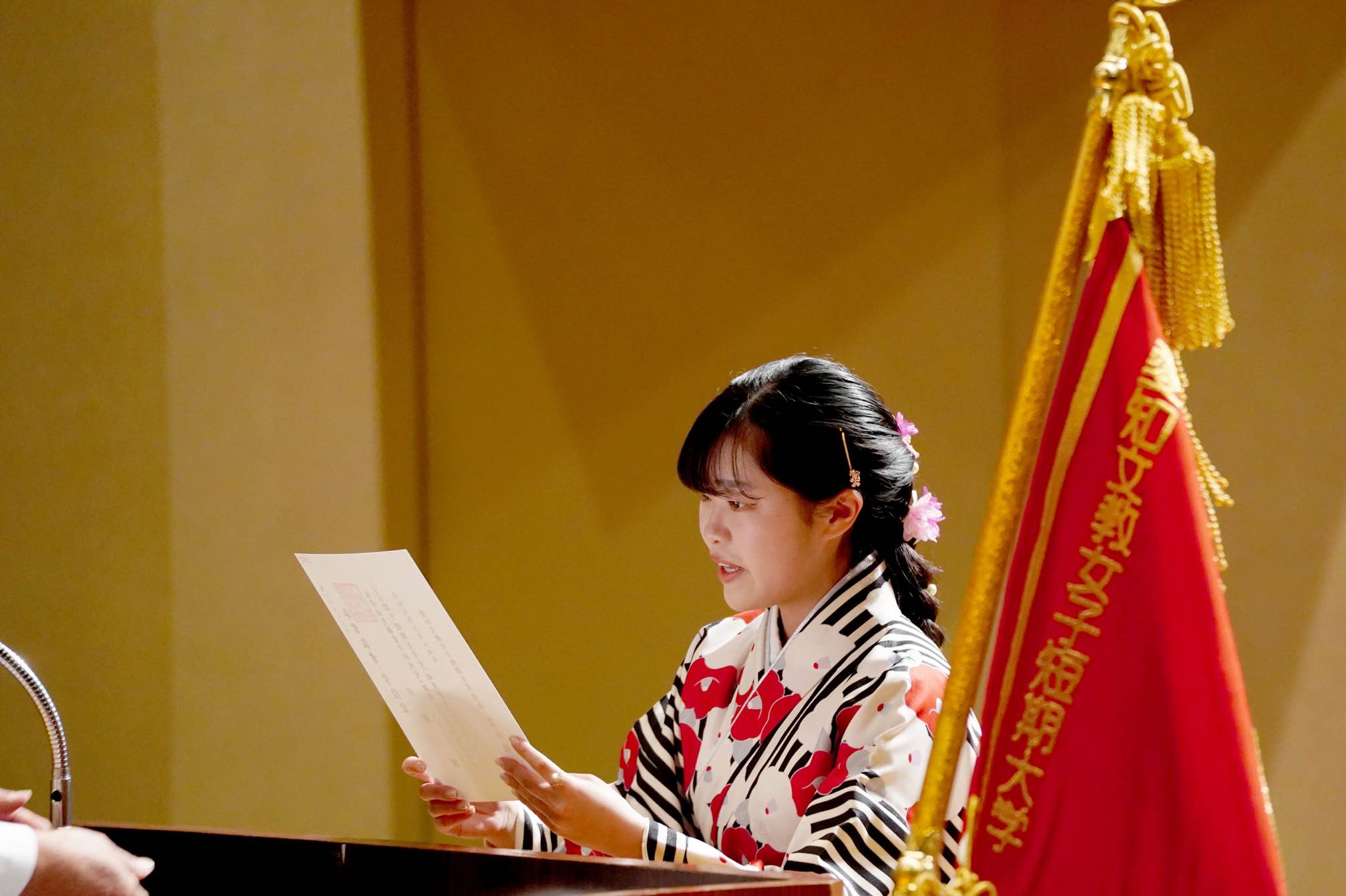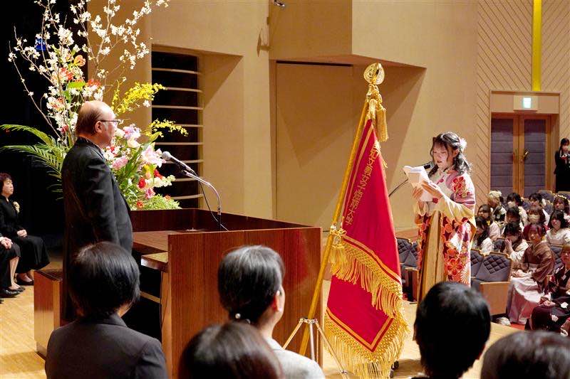 卒業生代表の挨拶では、在学中の思い出や教職員、友人、家族への感謝の気持ち、そしてこれからの新たな挑戦への意気込みが語られ、参列者の心に深く響きました。多くの方が、学生生活の思い出を振り返りながら、感動の涙を流されていました。玉田先生によるピアノ演奏が華を添え、文教女子愛があふれる雰囲気につつまれました。