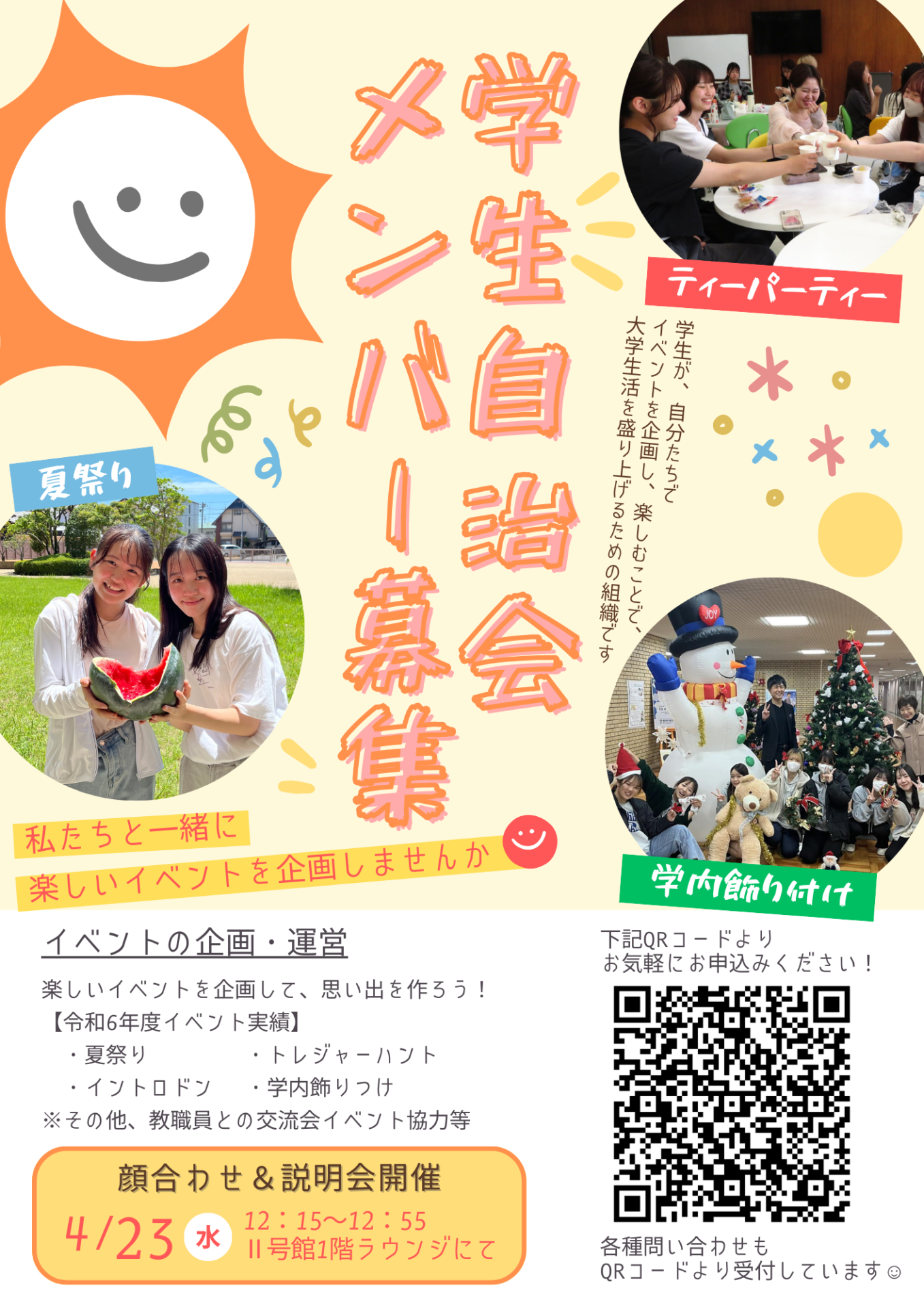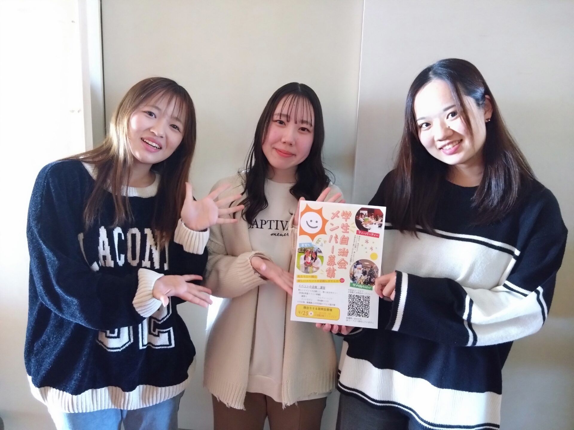 学生自治会メンバー募集のリーフレットも手作り。ぜひ興味のある人は、申込フォームから申し込みをお願いします!そして、今年度は大学祭も学生主導で開催予定。大学祭用のインスタグラムで情報発信していくので是非チェックしてください!