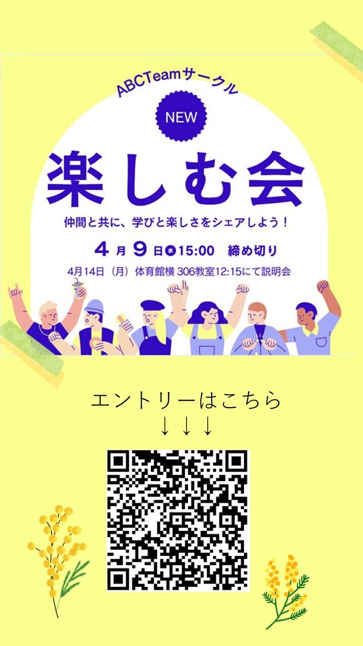 これから始まる学生生活。授業だけでなく、こうしたABCチームやサークル活動を通して、仲間と出会い、自分の世界を広げるチャンスを広げましょう!これからのキャンパスライフが、笑顔と出会いにあふれた素晴らしいものになりますように。