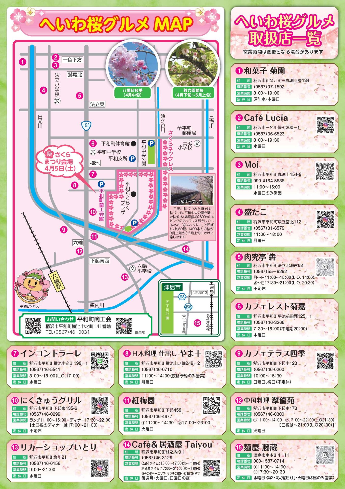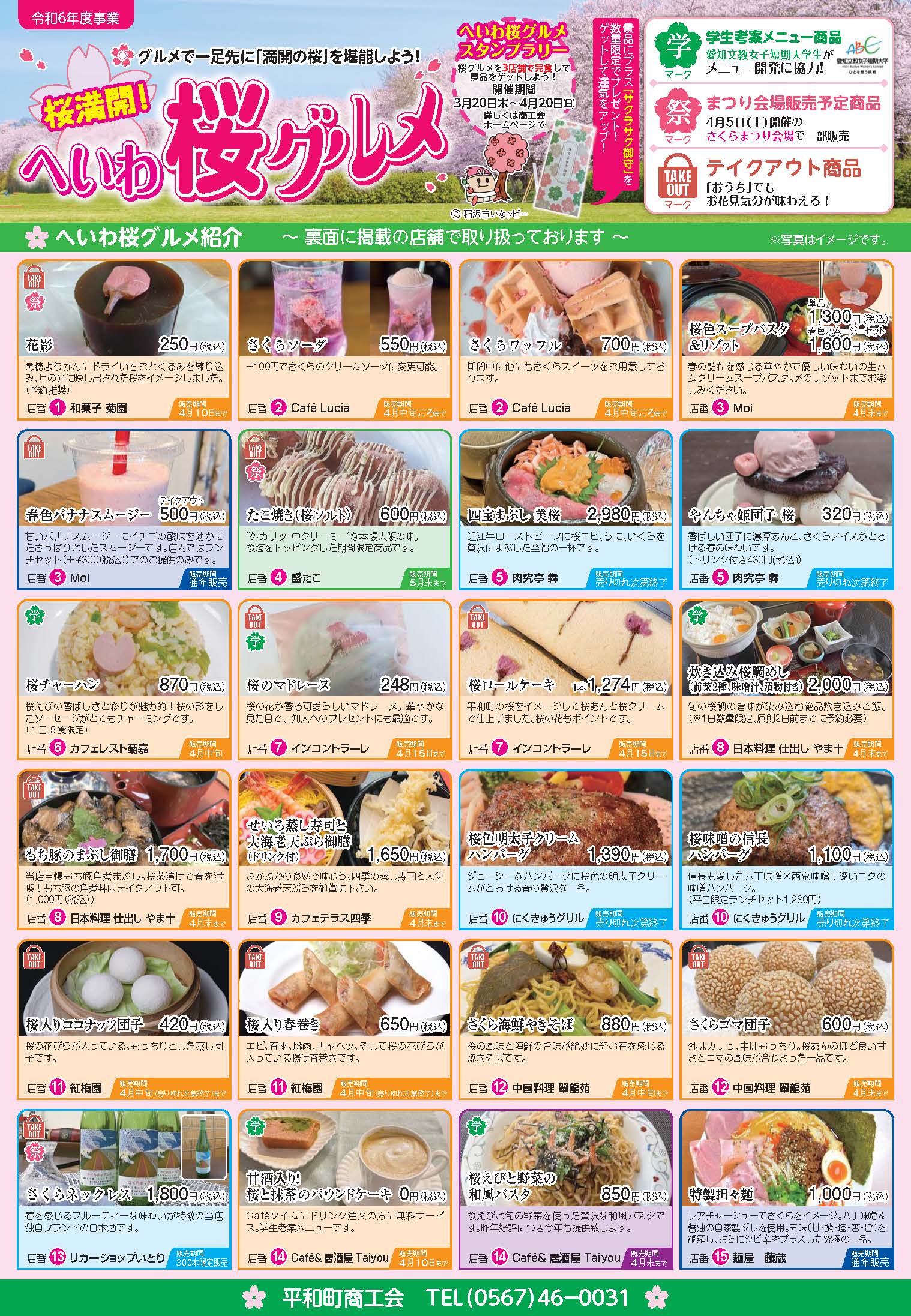チラシにある**緑色の桜マーク(学の白抜き)**が目印です。平和町周辺でしか味わえない、春限定のオリジナルメニューとなっています。