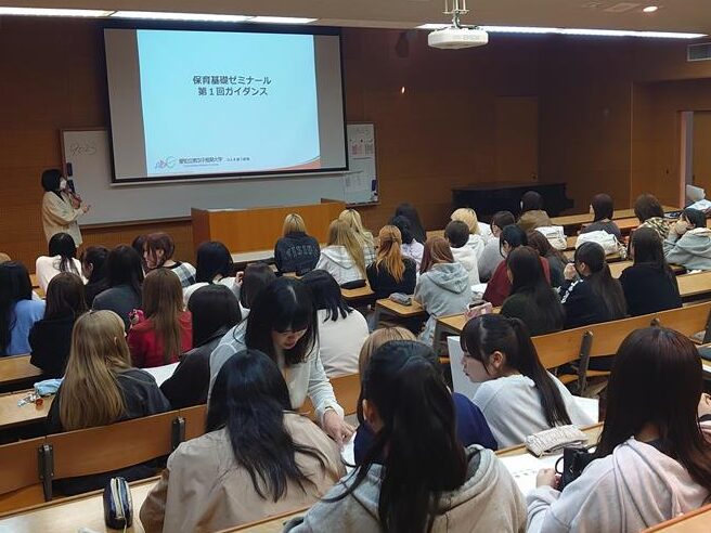 幼児教育学科の1年生を対象とした「保育基礎ゼミナール」が、いよいよ開講しました!この授業は、第1部・第3部合同で行われ、グループに分かれて活動していきます。保育者としての第一歩を踏み出す、まさに“はじまりの一歩”となる大切な時間です。