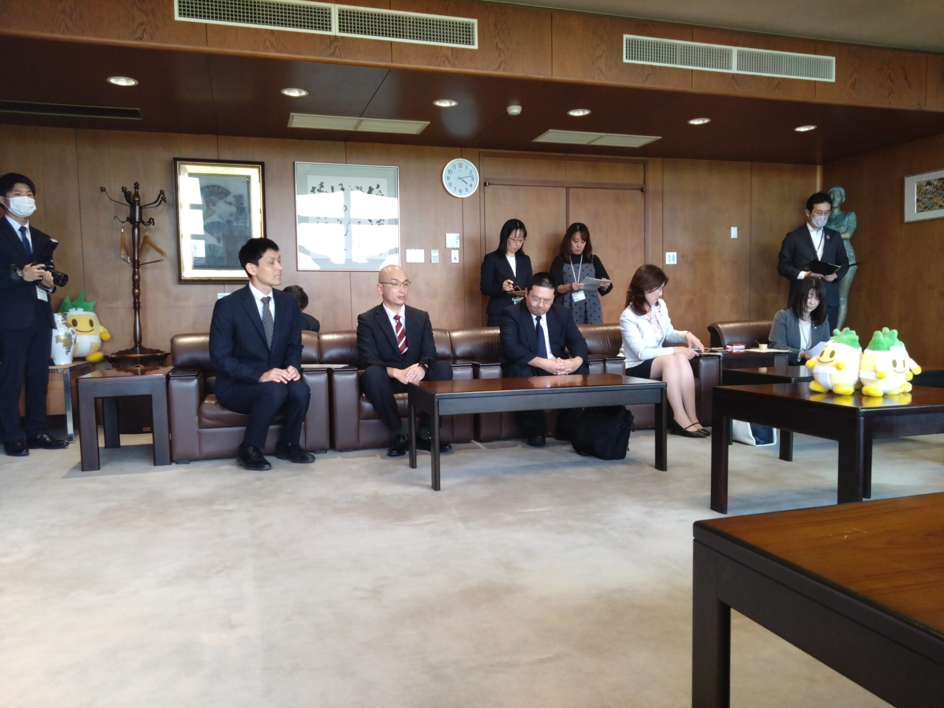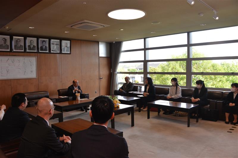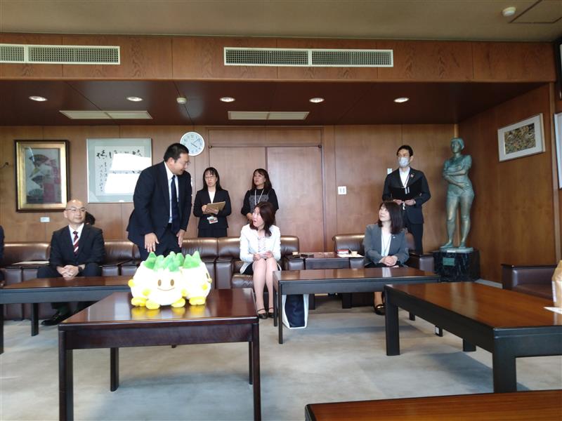 5月2日には、商品完成のご報告を兼ねて、稲沢市の市長を表敬訪問しました。学長からのご挨拶の後、学生たちがプロジェクトの説明をし、試食もしていただきました。