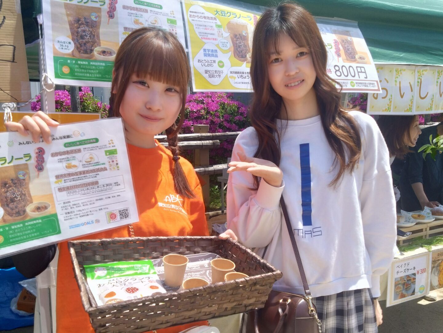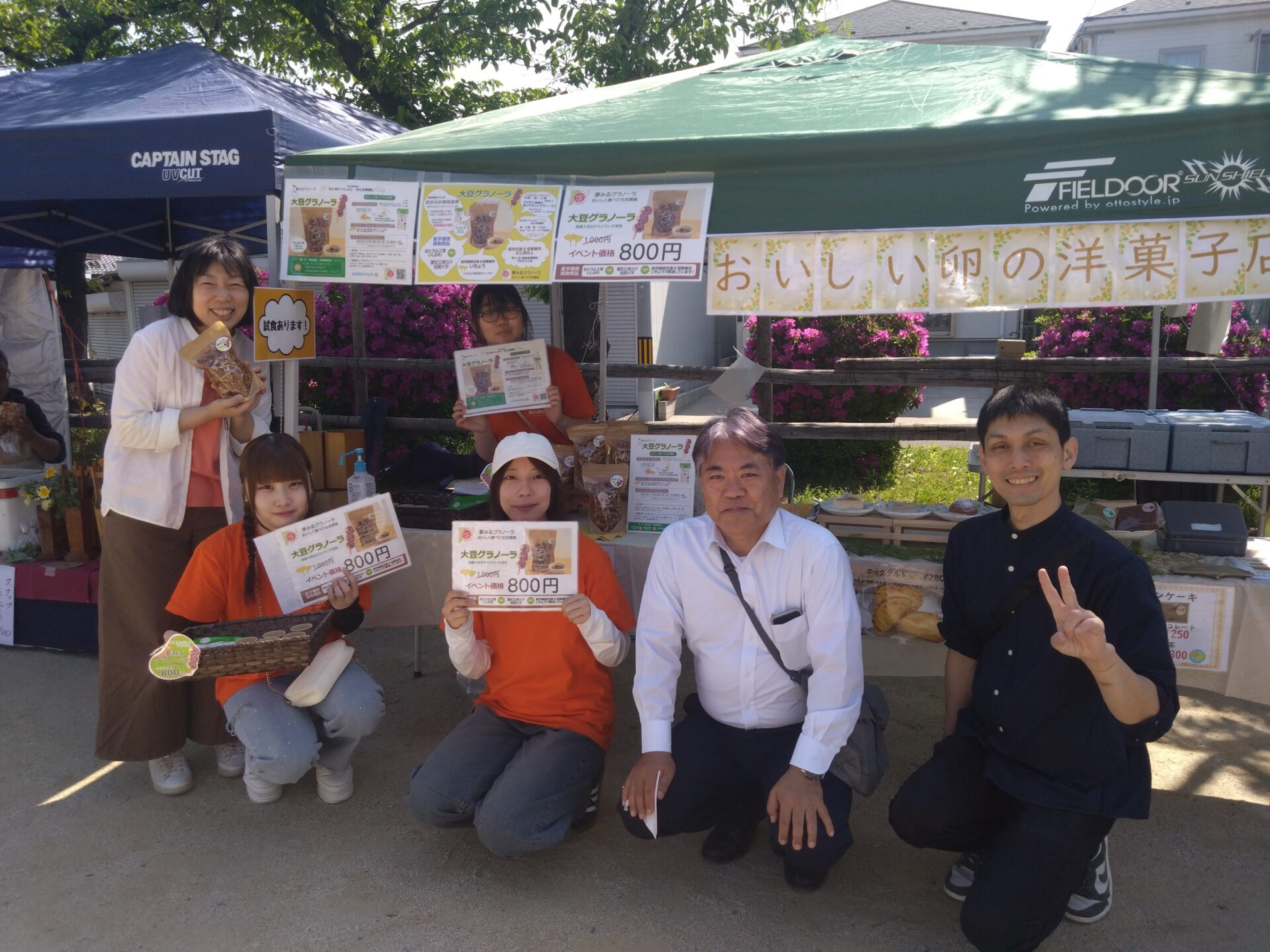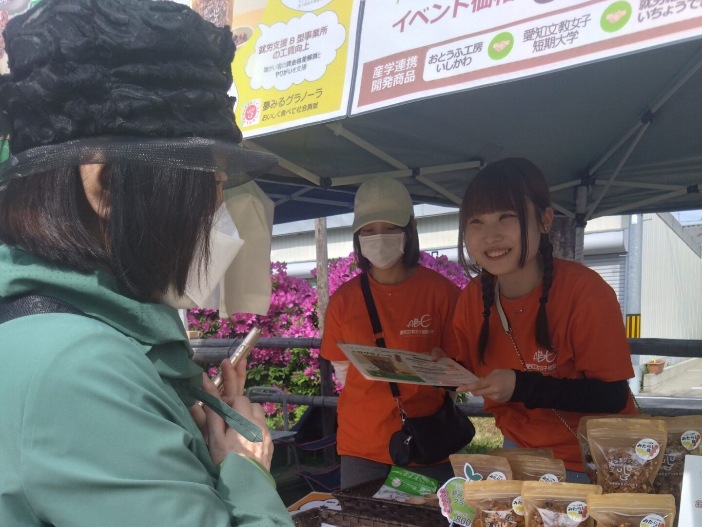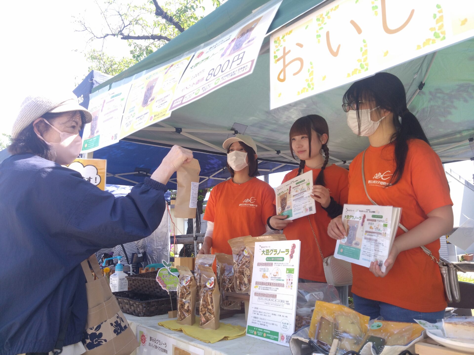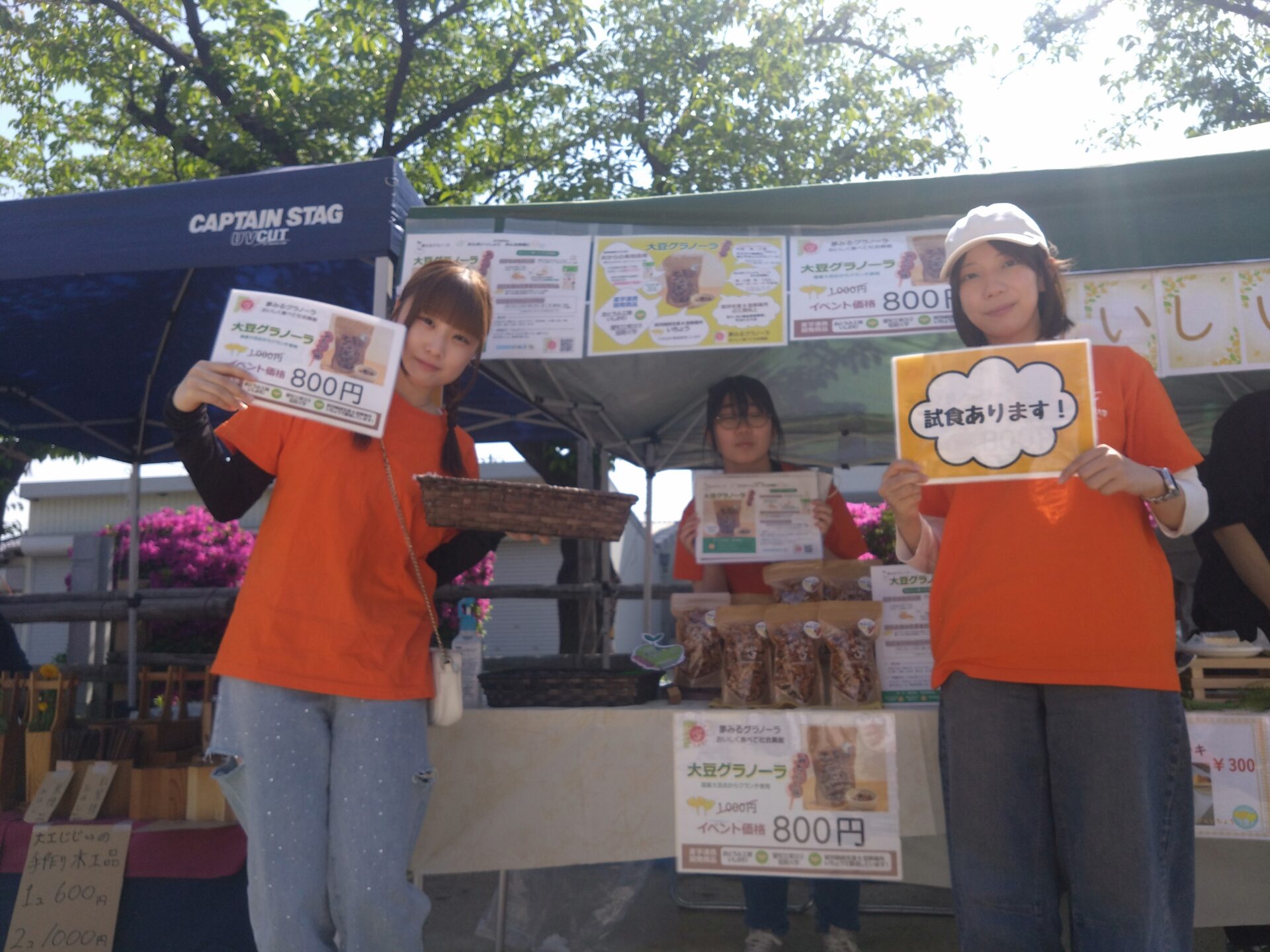 オレンジのTシャツを着た学生たちが、いちょうのスタッフと一緒に試食販売を行いました。たくさんの方に興味を持ってもらい、お子さんからご年配の方まで、幅広い層から「おいしい!」と好評をいただきました。卒業した先輩や地域でお世話になっている方々もブースに寄っていただき嬉しかったです!