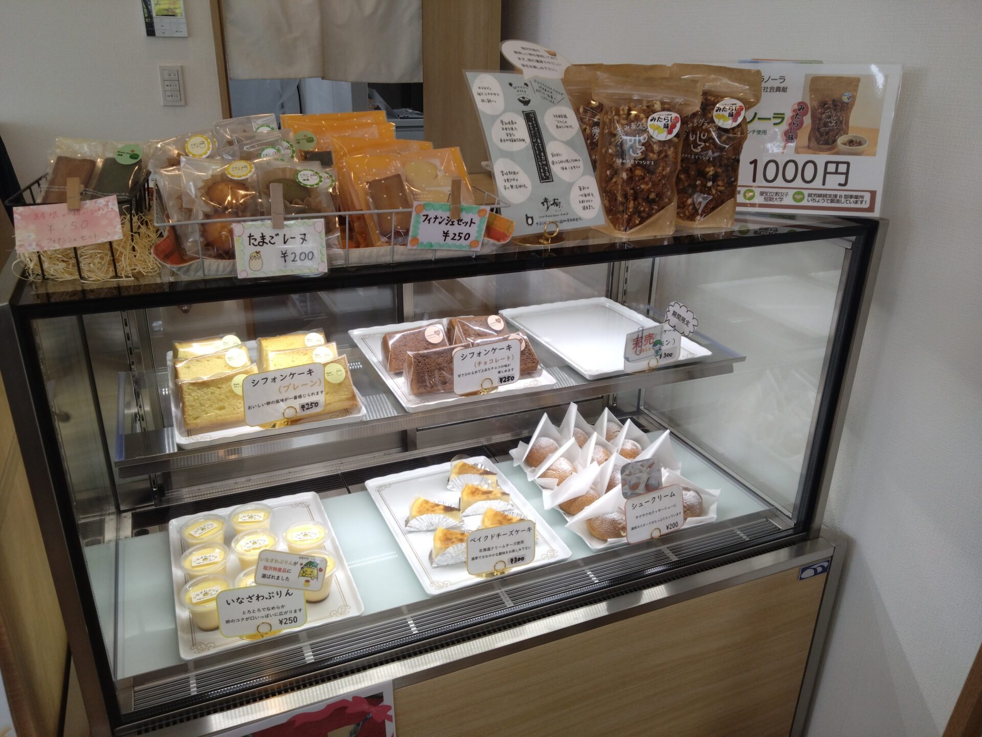 稲沢市産「歩荷(ぼっか)」の自然卵を使用した、口の中でとろけるなめらかなプリンやシュークリーム、シフォンケーキなどもおすすめです。のどかな風景がを眺めながら、のんびりとできるカフェ。テイクアウトもできます。