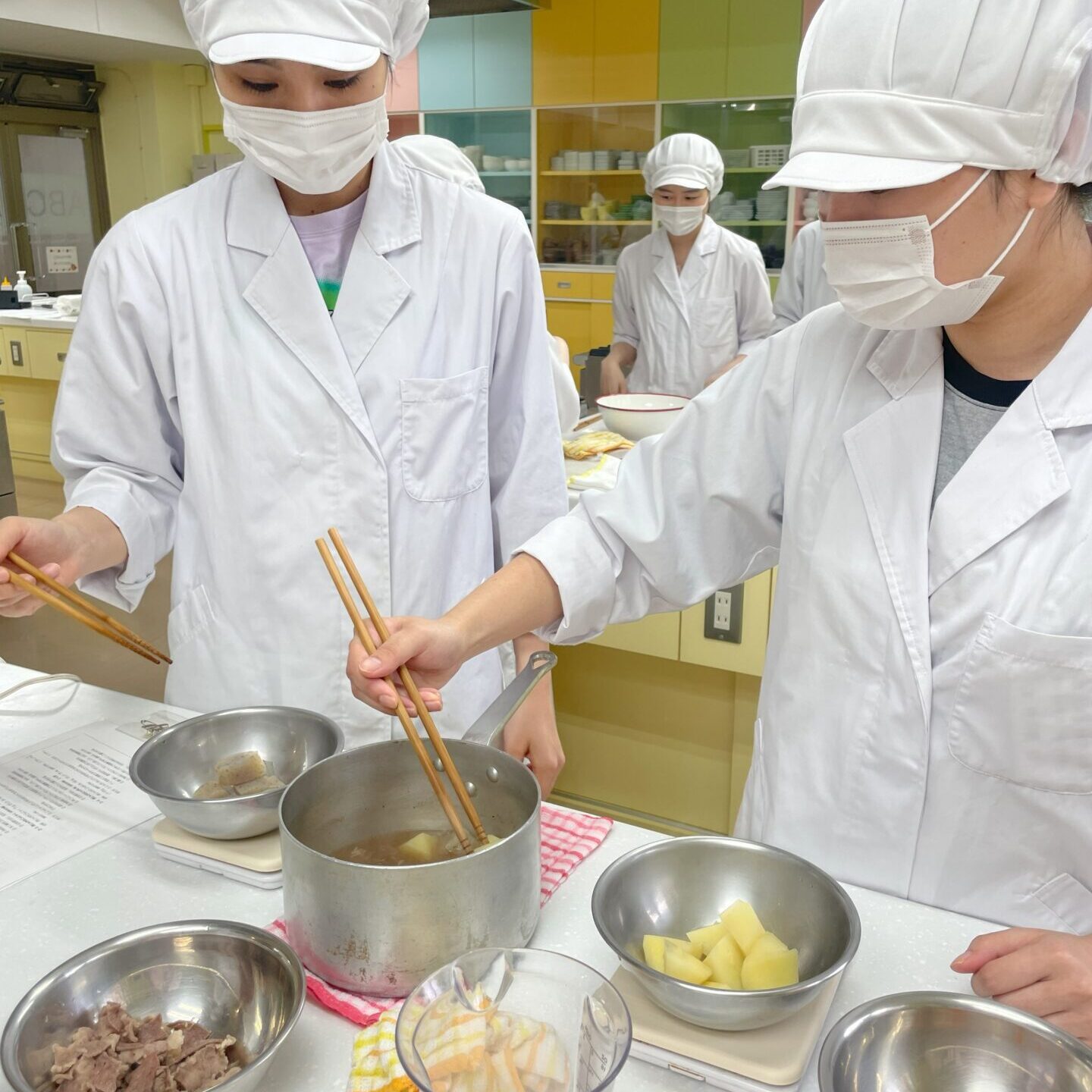 この日の実習では、通常の「肉じゃが」を作った後、具材ごとに取り分けてミキサーにかけ、ゼリー状に固めて再度“元の形”に整えて盛り付けるという調理法を学びました。