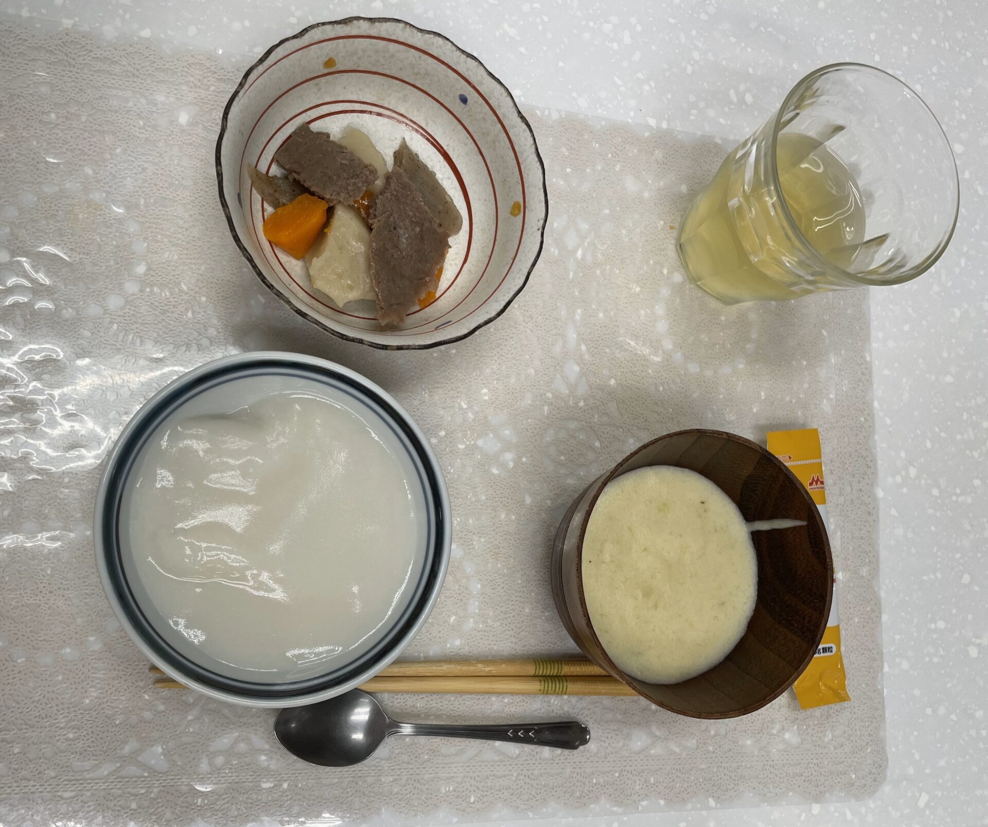 ゲル化剤(ゼリーのように固めるとろみ調整食品)を加えて加熱し、冷やすと固まります。見た目は普通の肉じゃがそのもの。でも、口に入れるとすっとつぶれ、無理なく飲み込めるやわらかさです。「食べられないから我慢する」のではなく、「見た目も味も楽しめる食事」を提供することの大切さを、食べる側の視点に立ってその重要性を実感しました。
