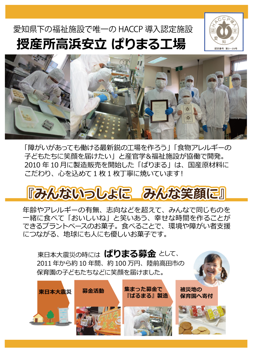 「ぱりまる」は、授産所高浜安立、おとうふ工房いしかわ、そして愛知文教女子短期大学の産学福連携で開発された、2010年誕生のロングセラー商品です。今回の販売は、中部三本珈琲株式会社様とのご縁から実現しました。