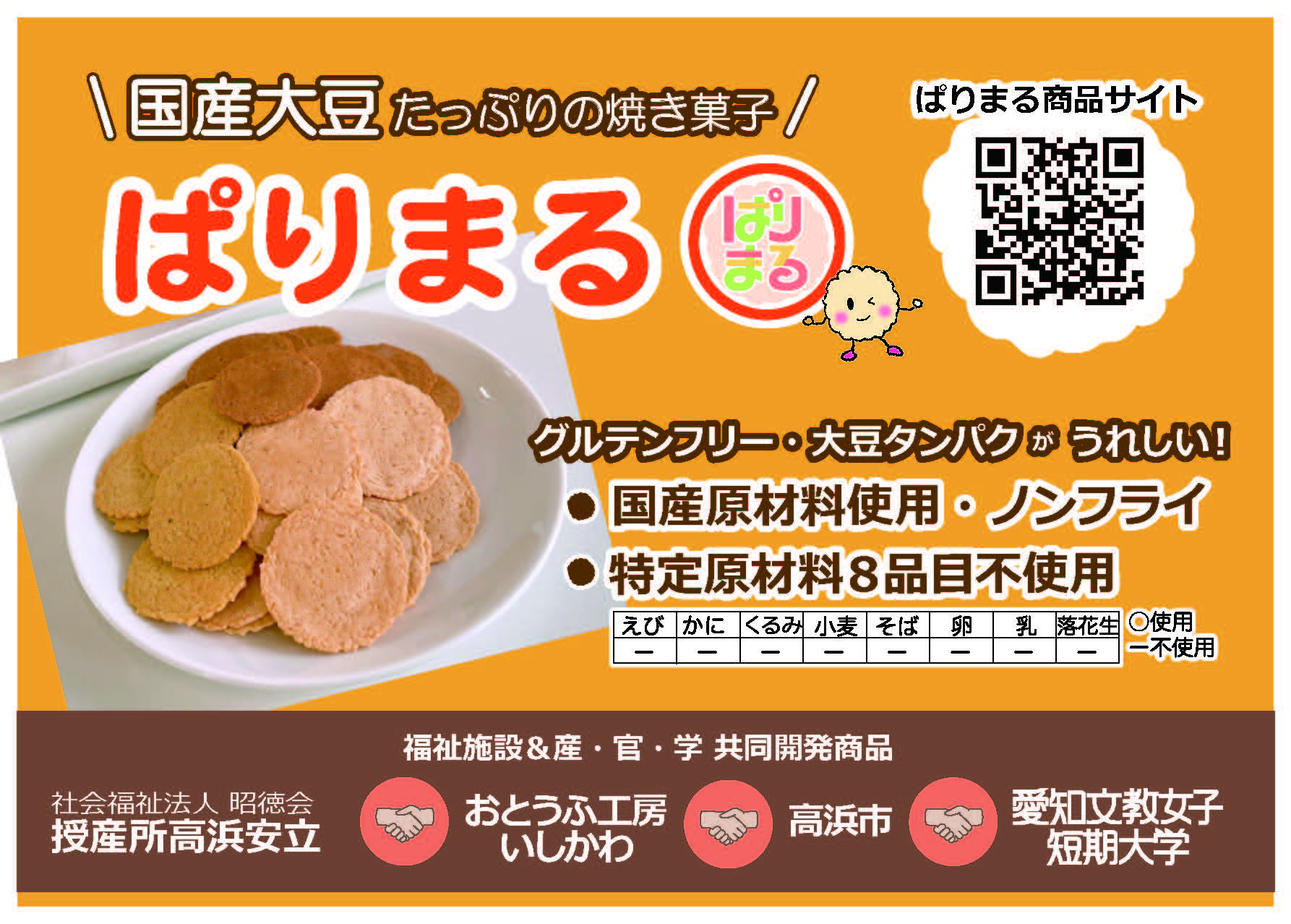 『ぱりまる』は、大豆・米粉・おからから作られた、プラントベース食品で、グルテンフリー。無添加、ノンフライでたんぱく質も豊富なヘルシー焼き菓子です。特定原材料8品目を使用しておらず、アレルギーに配慮が必要な方にも、お子さまからご年配の方までみんな一緒に“おいしい笑顔”を楽しめるお菓子です。 ※大豆は使用しています。