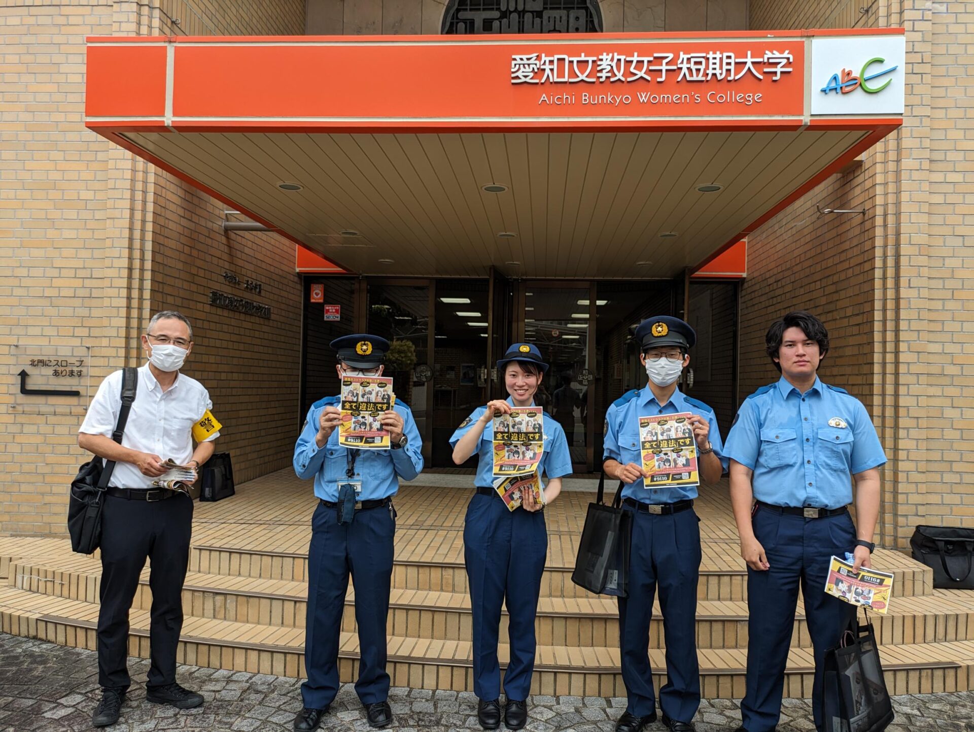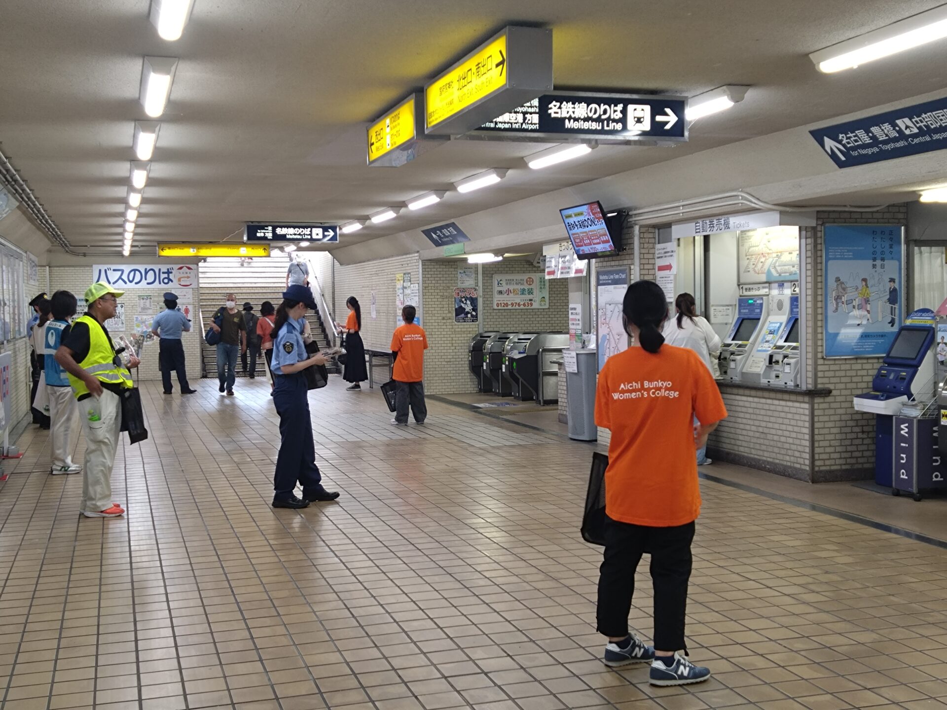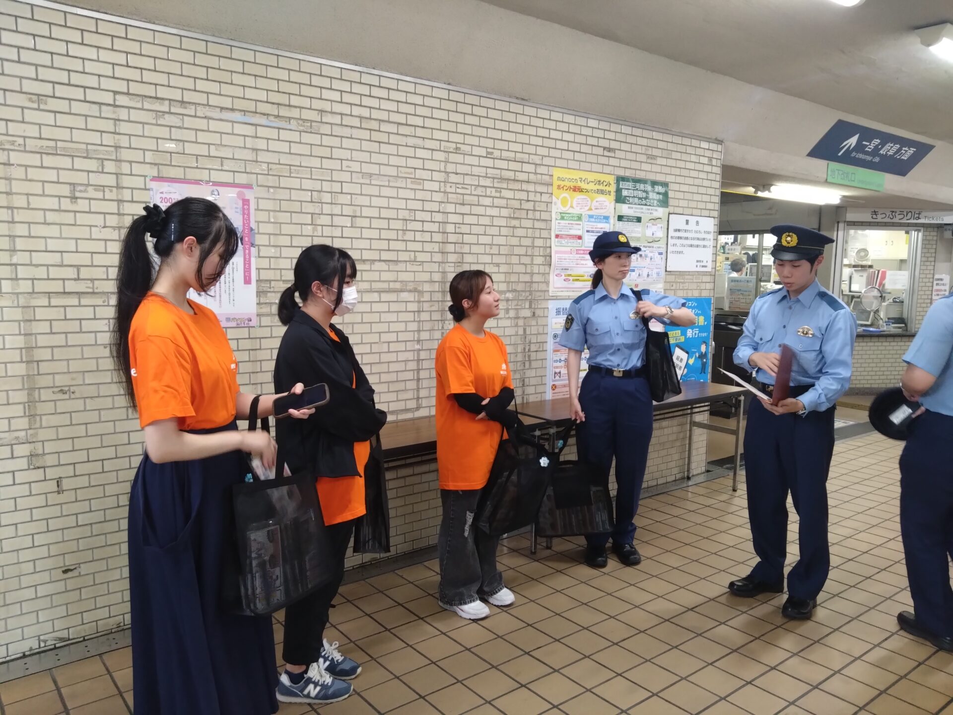 一部の学生様を除き、皆様初めての防犯活動でしたが、比較的、スムーズに声掛けから啓発品の配布までをこなされていました。一方で活動中、学生の声掛けや受取りを拒まれる場面を何度も拝見しました。しかし、皆様はそのようなことを全く気に留めない様子で、次の利用者へと活動を続けられました。そんな学生様の様子を見て、前向きな姿勢と物事をやり遂げるという気持ちを強く感じました。また、参加された皆様が、警察から託された啓発品を全て配布されました。愛知文教女子短期大学の学生様の応用力の高さや前向きな姿勢により、市民への良い広報活動を行うことができたと思っています。