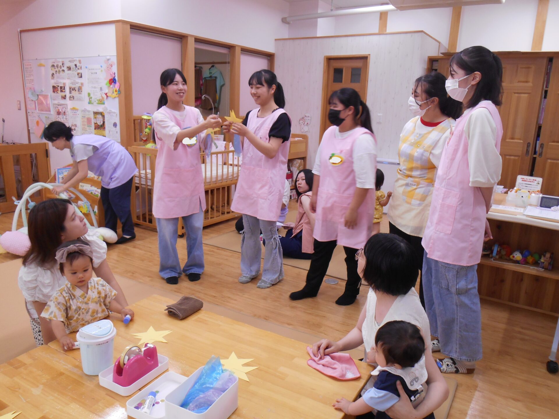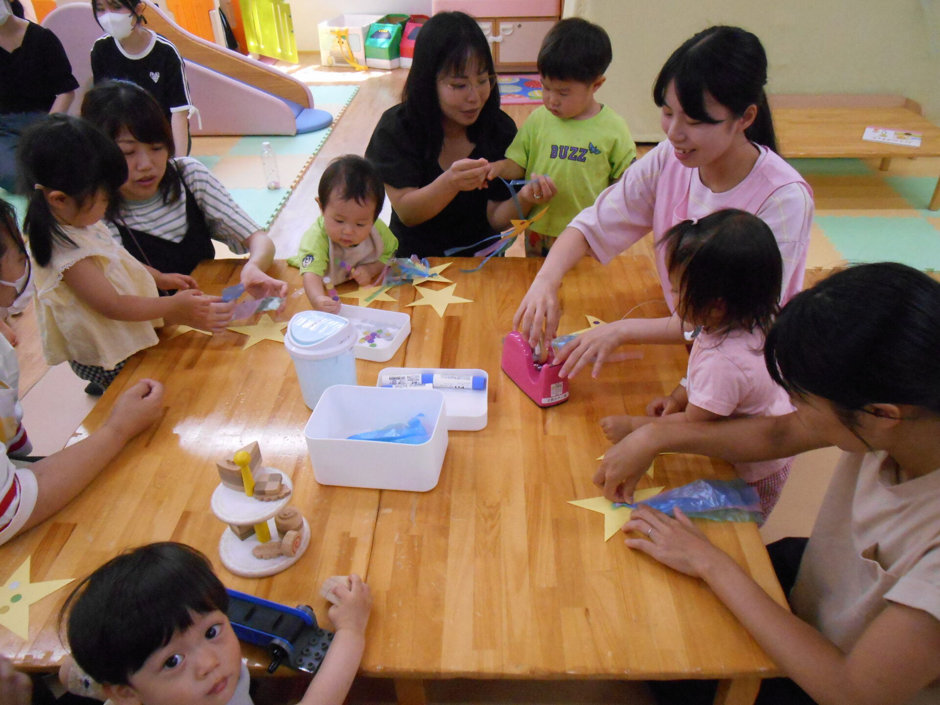 1週目は、星形の台紙にシールを貼ったり、タフロンテープを手で裂いたりなどの活動を子どもたちが楽しめるよう、乳児の発達段階に合わせて工夫を凝らしながら制作遊びの準備をしました。