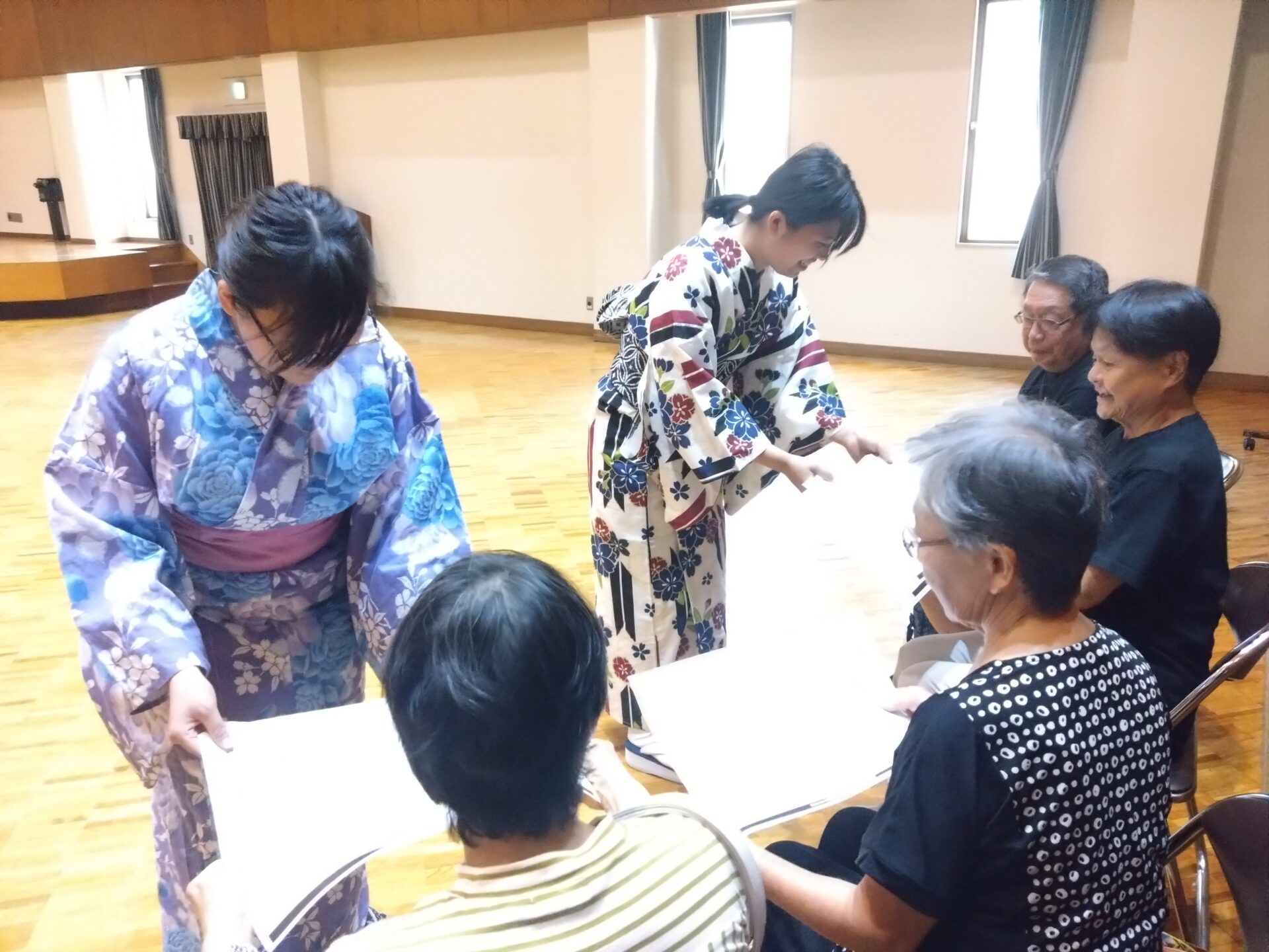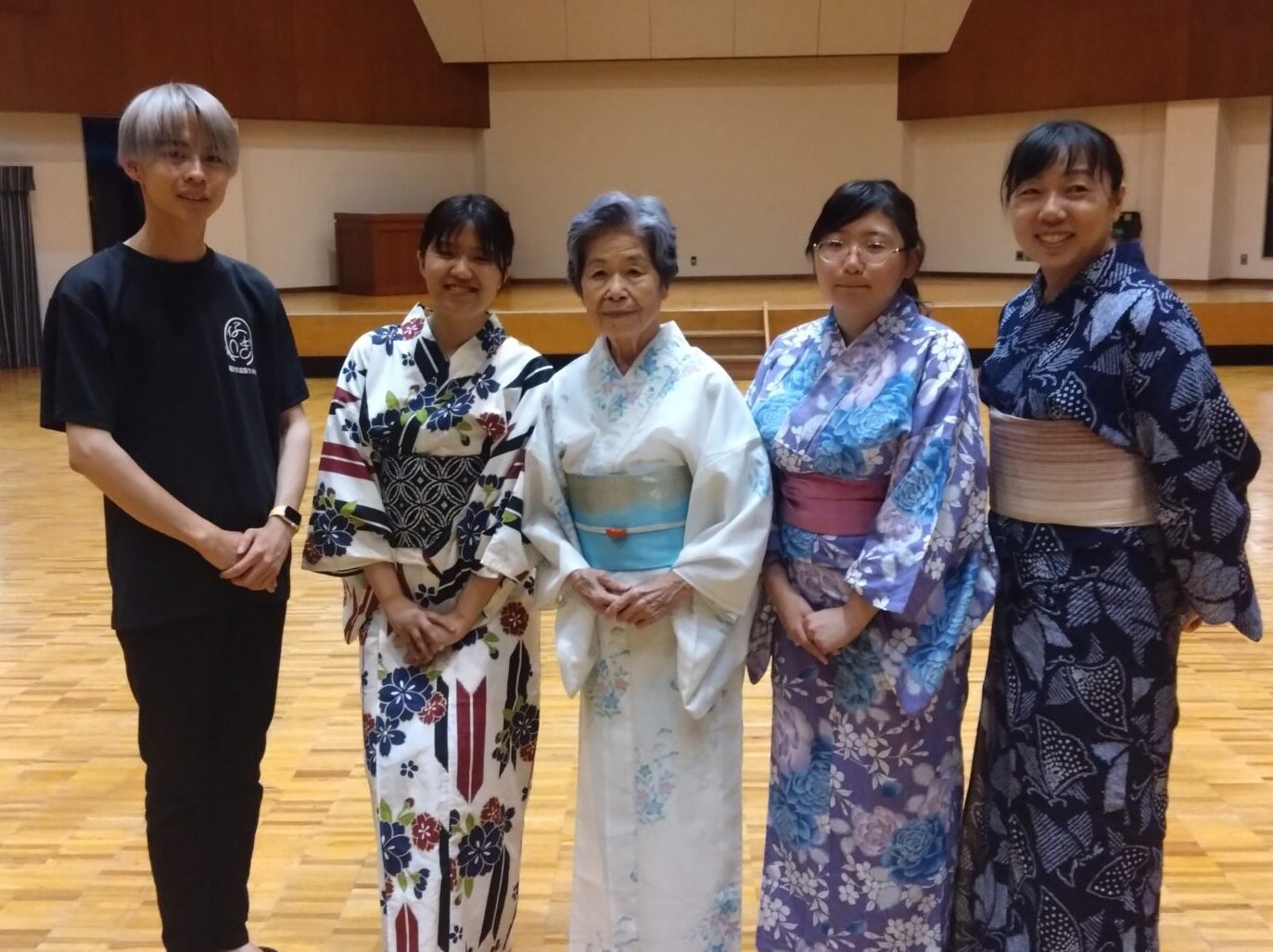 稲沢に伝わる伝統の盆踊り「稲沢音頭」「稲沢よいとこ」「いなッピー音頭」を丁寧にかっこよく踊るポイントを伝授する、初心者も楽しく体験できる稲沢市文化振興財団との協働講座。浴衣を着て、受付や講座がスムーズに運営できるように参加者に声をかけたりと、笑顔で活動を行いました。