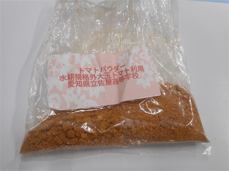 このトマトパウダーは、水耕栽培で規格外となった大玉トマトを佐屋高校で加工したもの。なんと、生のトマトよりリコピンやうまみ成分が豊富に含まれているのが特徴です🍅