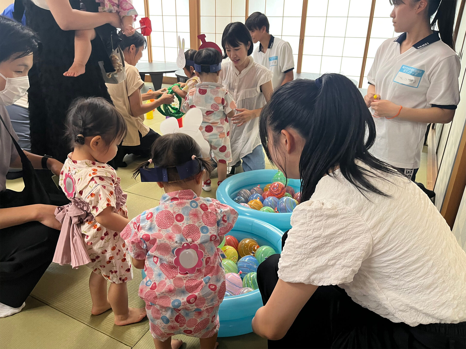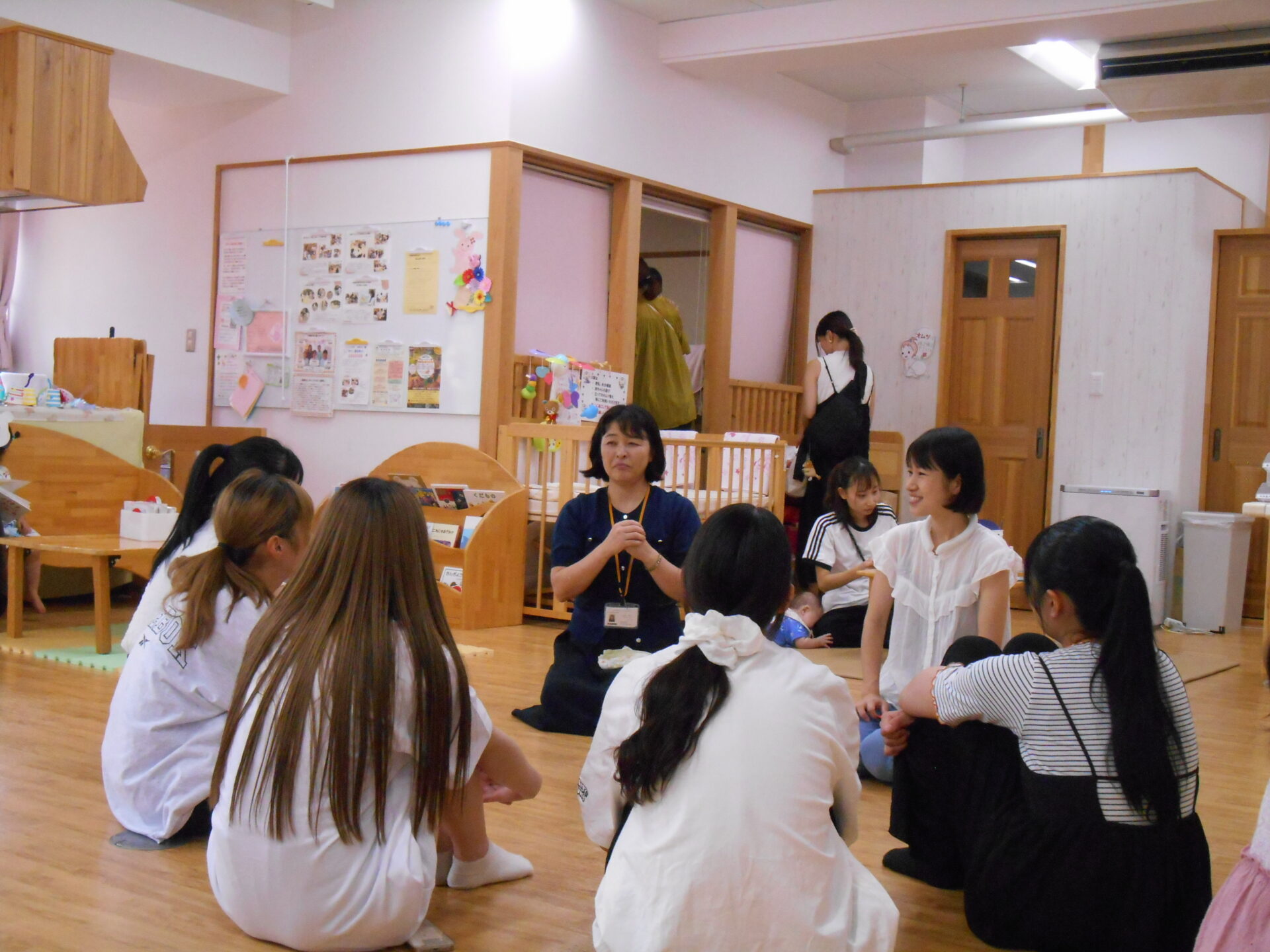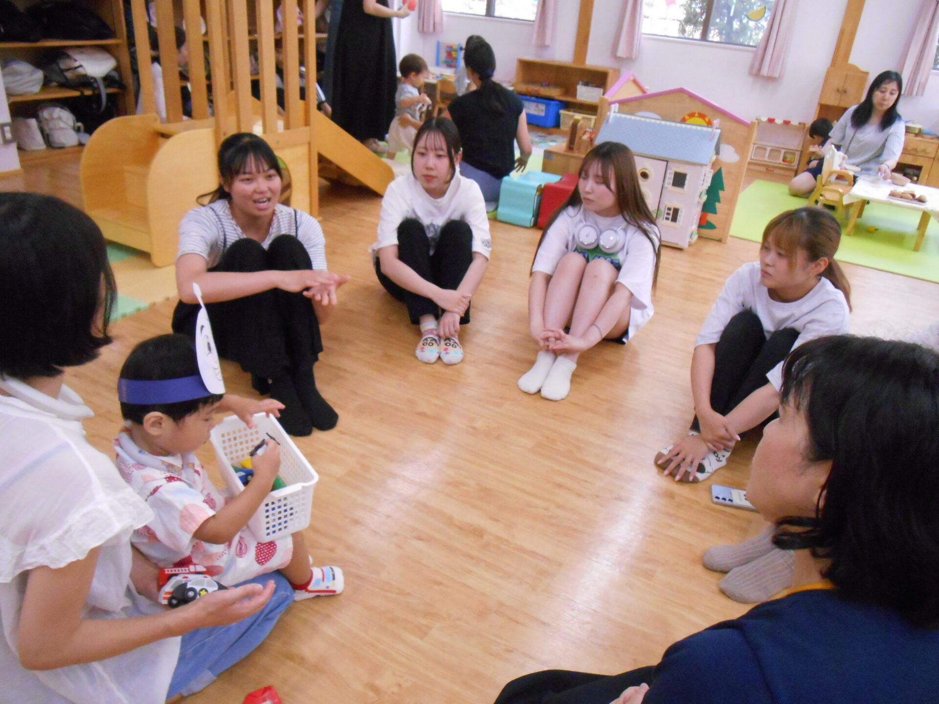 前半は「おやこ園」の夏祭りを見学し、0~2歳児の子どもの姿や乳児向けに工夫された遊び環境を体験しました。学生からは「環境の工夫に感動した」との声が多く聞かれました。