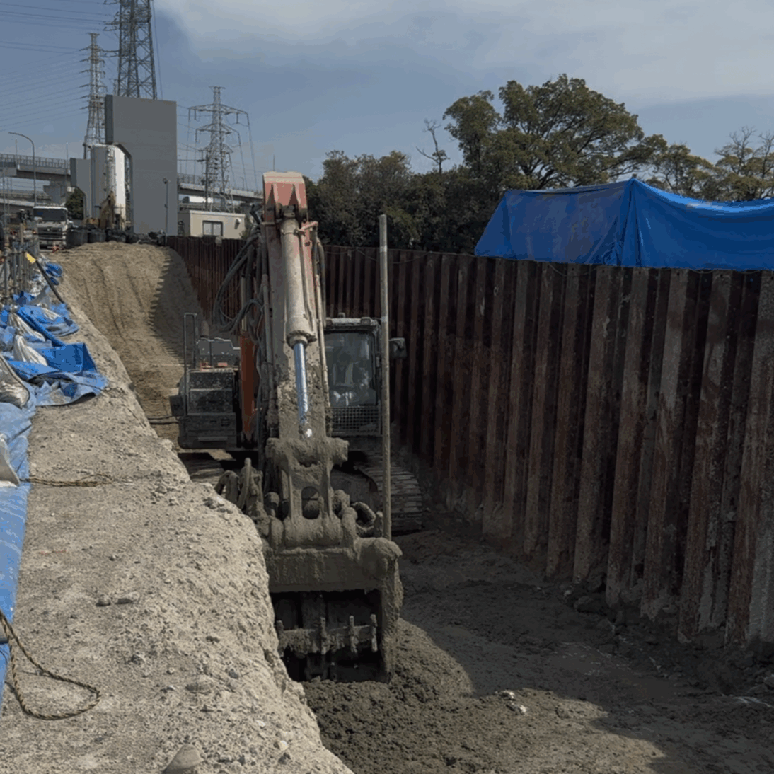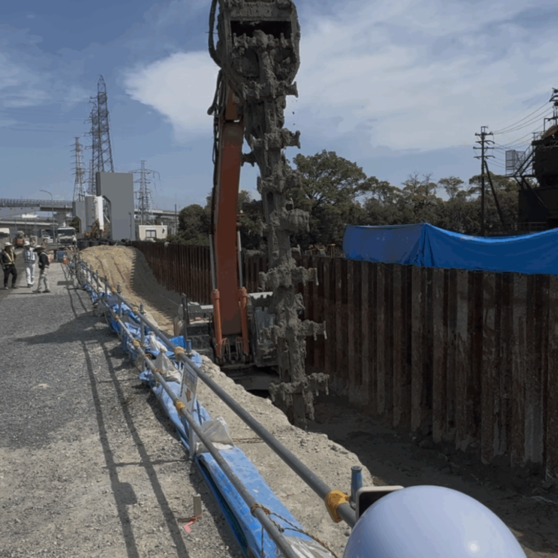 深さ8mまで掘削できるチェーンソーのような重機が稼働し、回転部分からミルク状のコンクリートを流し込みながら掘り進めていきます。これにより地盤を強化し、その上にコンクリートブロックを設置していくとのことでした。