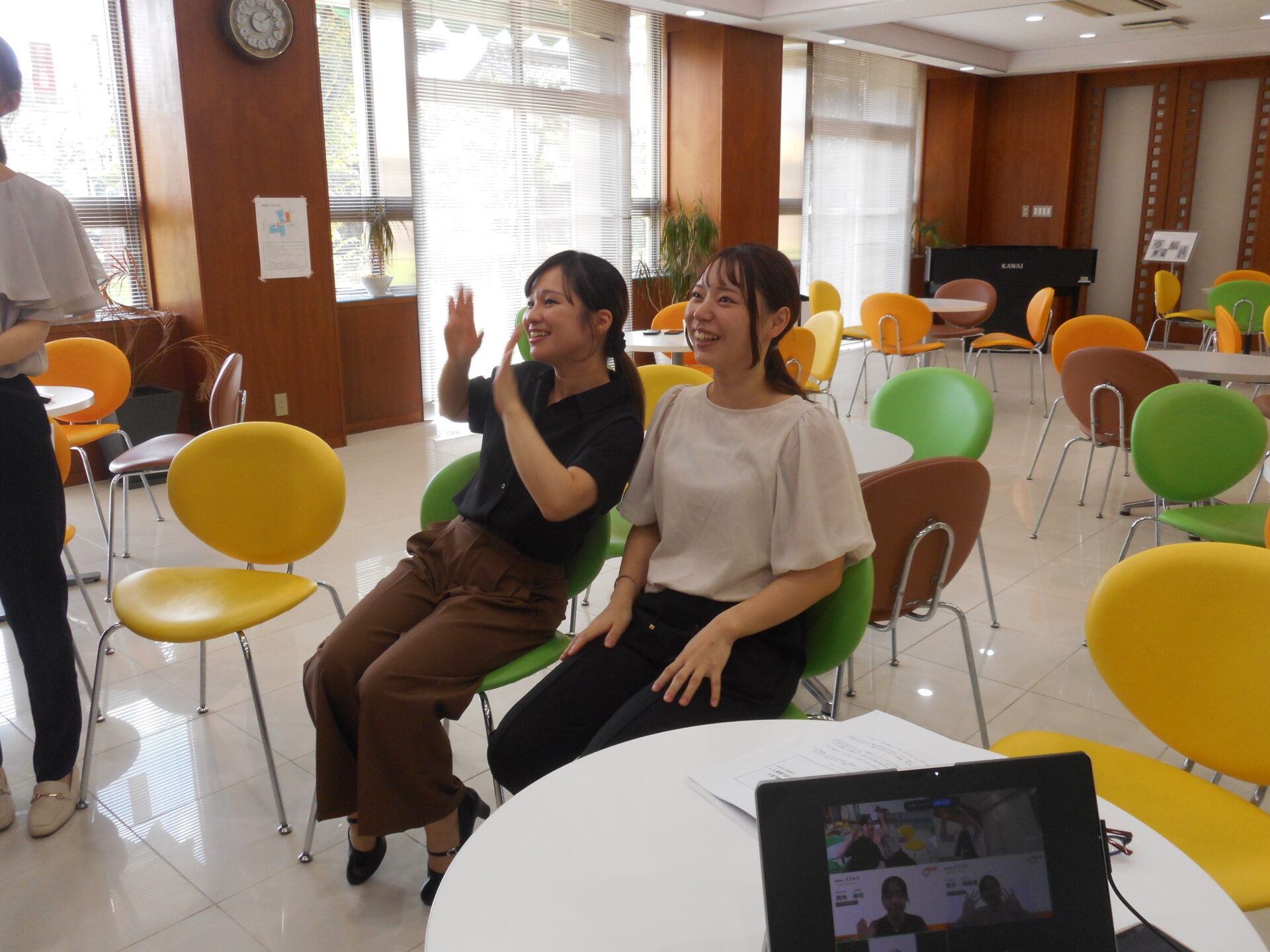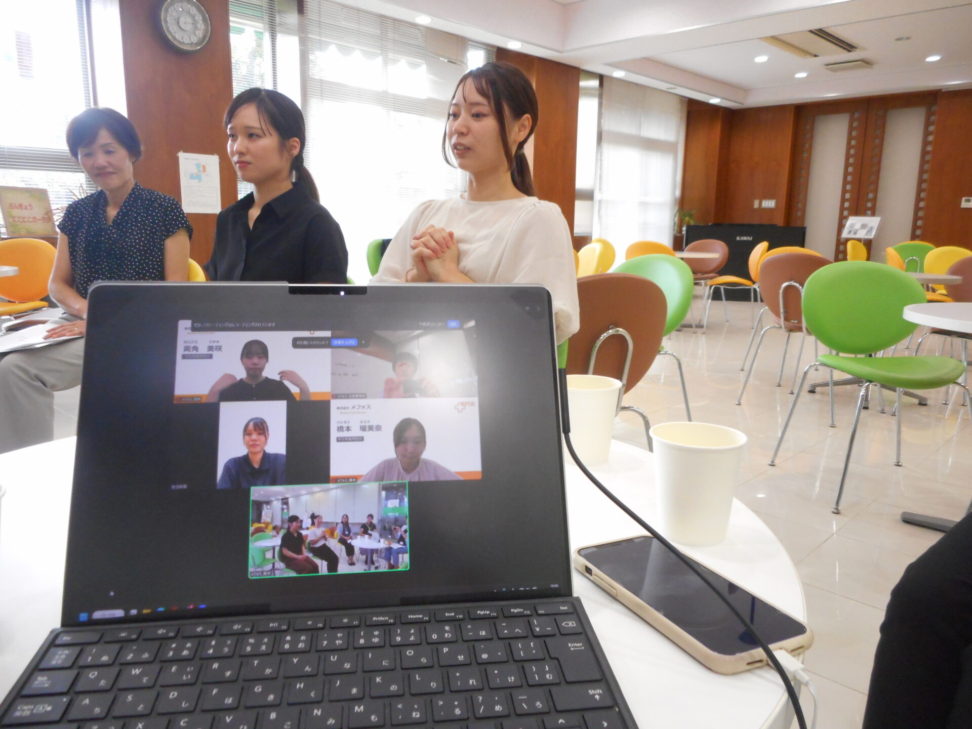 当日は、高齢者福祉施設に勤務する古田麻衣さん(令和2年度卒)、企業の社員食堂に勤務する岡 志織さん(令和3年度卒)が来学し、長野県の高齢者福祉施設に勤務する生玉彩菜さん(令和5年度卒)はWebで参加されました。