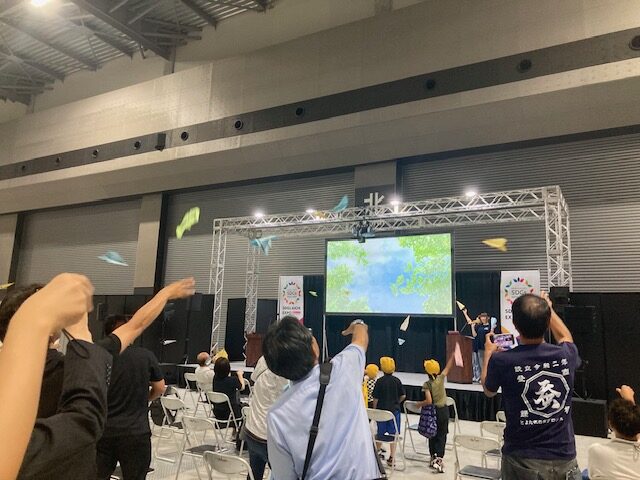 ステージのラストでは、参加者全員で紙飛行機を折り、スクリーンの青空に向かって未来への想いを込めて飛ばしました。会場全体が一体となり、心温まる時間となりました。