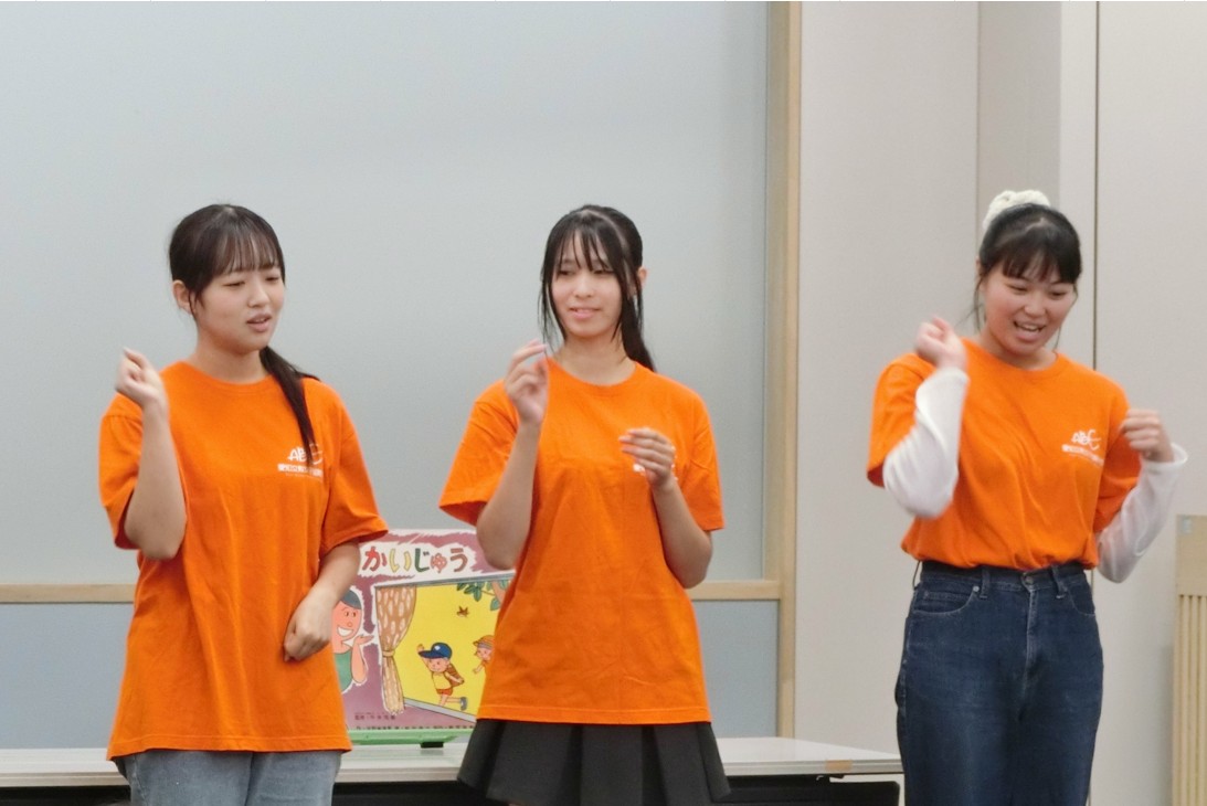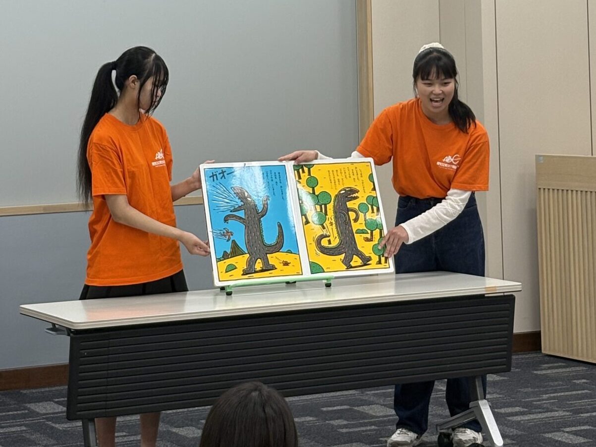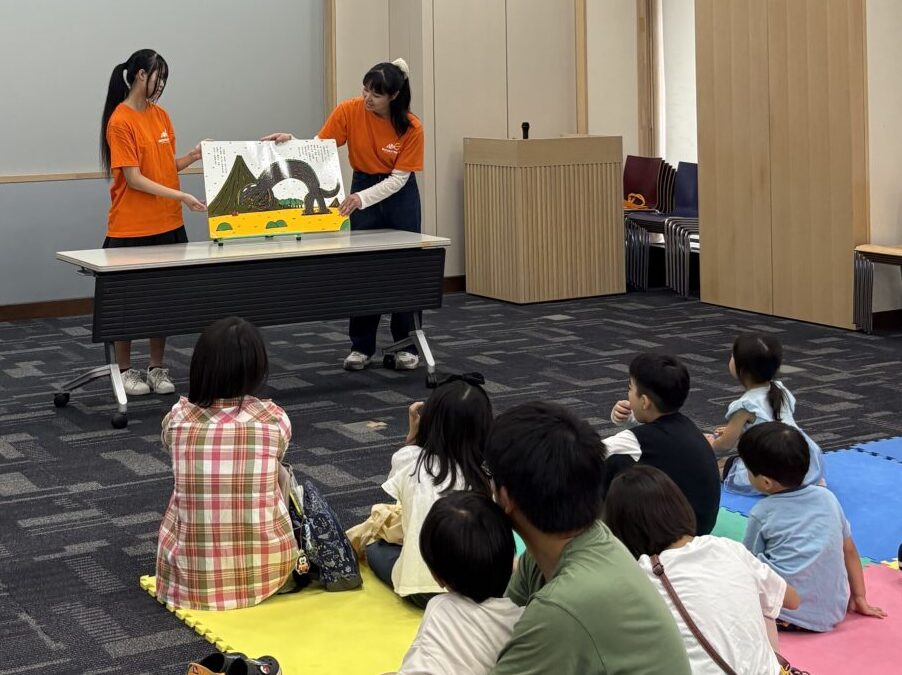 10月4日(土)、稲沢市中央図書館で行われた「お楽しみ会」に、幼児教育学科の学生たちが参加しました。手遊び「はじまるよ」から始まり、紙芝居『るすばんかいじゅう』、大型絵本『おまえうまそうだな』の読み聞かせ、さらに「やきいもグーチーパー」や「ジャンケン列車」など、笑顔あふれるプログラムを展開しました。
