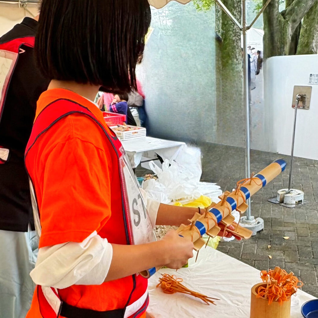 10月11日(金)には、サリオパーク祖父江で開催された「サンドフェスタ」のボランティアに参加しました。学生たちは「竹てっぽうを作って遊ぼう」コーナーのスタッフとして、竹てっぽうの作り方の補助や弾拾い、竹とんぼの配布などを担当しました。笑顔で積極的に声をかけ、子どもや保護者の方々との交流を楽しむ姿が見られました。