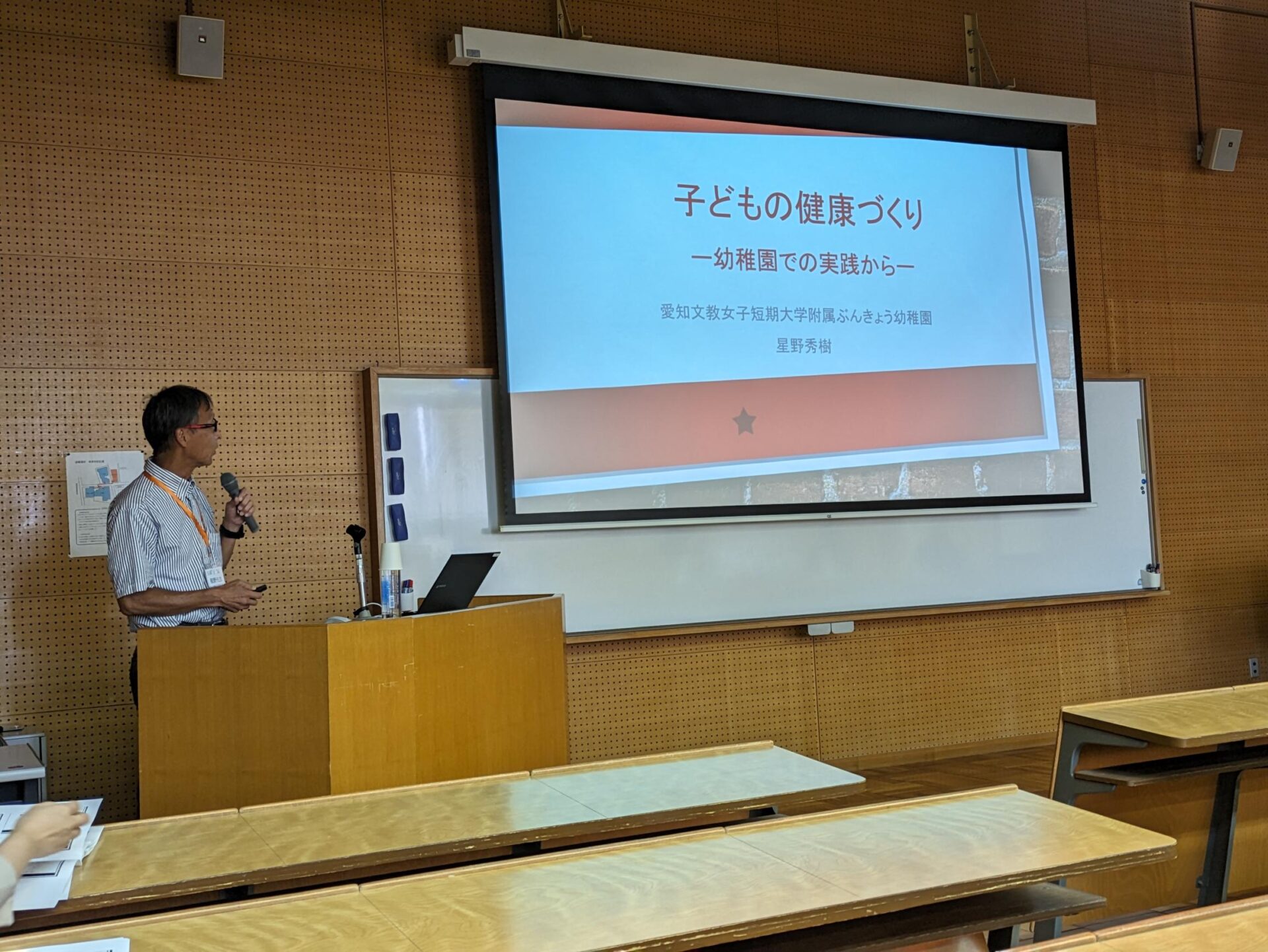 基調講演では、愛知県立芸術大学の石垣享先生よりお話をいただき、続くシンポジウムでは、岐阜大学の小木曽加奈子先生と本学の幼児教育学科教員の岡田摩紀先生による「運動・レクリエーションによる健康づくり」、そして本学の幼児教育学科教員 兼 ぶんきょう幼稚園園長の星野秀樹先生による「子どもの健康づくり―幼稚園での実践から―」の講演が行われました。