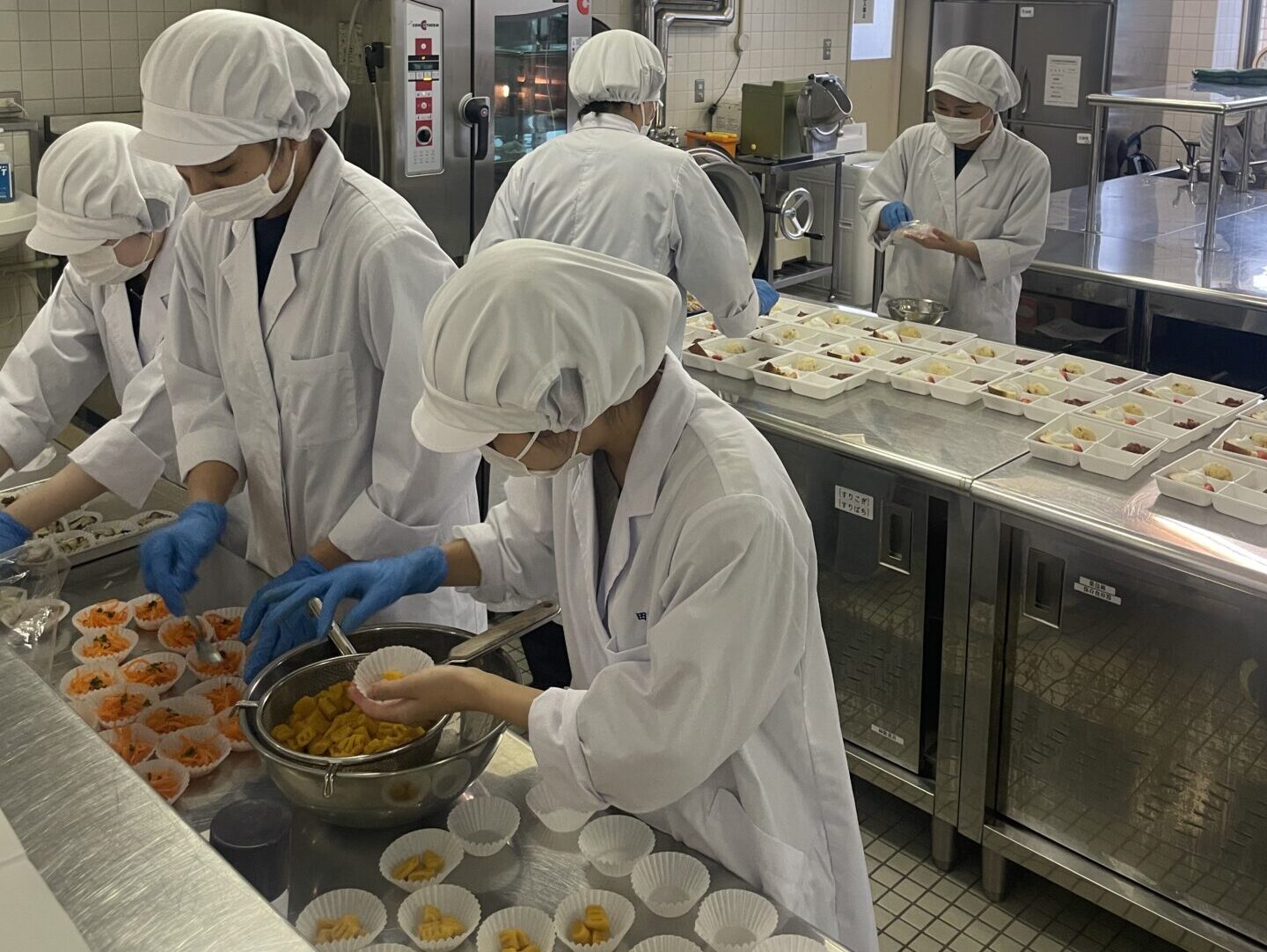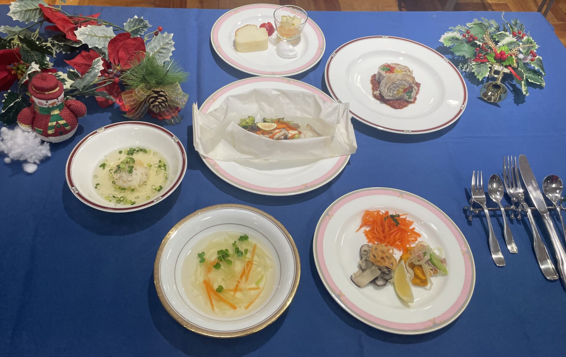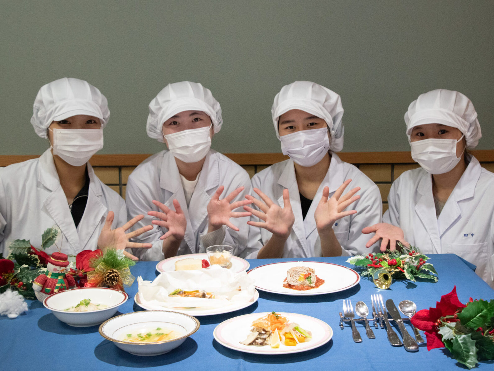 「みんないっしょのクリスマス」の魅力は、献立に特定原材料を使用しないだけでなく、クリスマスらしい華やかさとおいしさを両立したフルコース料理を提供できることです。卵・小麦・乳製品を使わずに洋食のフルコースを仕上げるのは決して簡単ではありませんが、学生たちは「私たちにもできる!」という確かな手ごたえを感じながら試作に取り組んでいました。