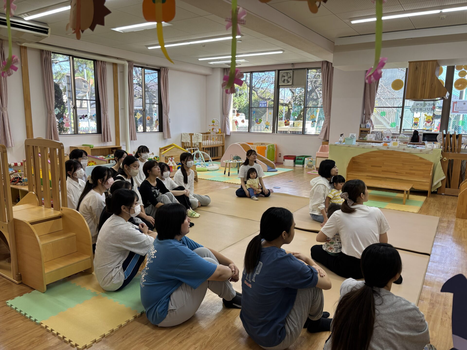文教おやこ園では、やさしい先生やお母さんたちと一緒に過ごす子どもたちの笑顔があふれており、その様子に学生たちも思わず笑顔に。子どもたちと触れ合う中で、保育現場でのコミュニケーションの大切さや、温かな雰囲気づくりの重要性を改めて感じる時間となりました。学生たちは「とても楽しかった」「子どもたちの笑顔が印象的だった」と話し、やさしい表情で帰ってきました。