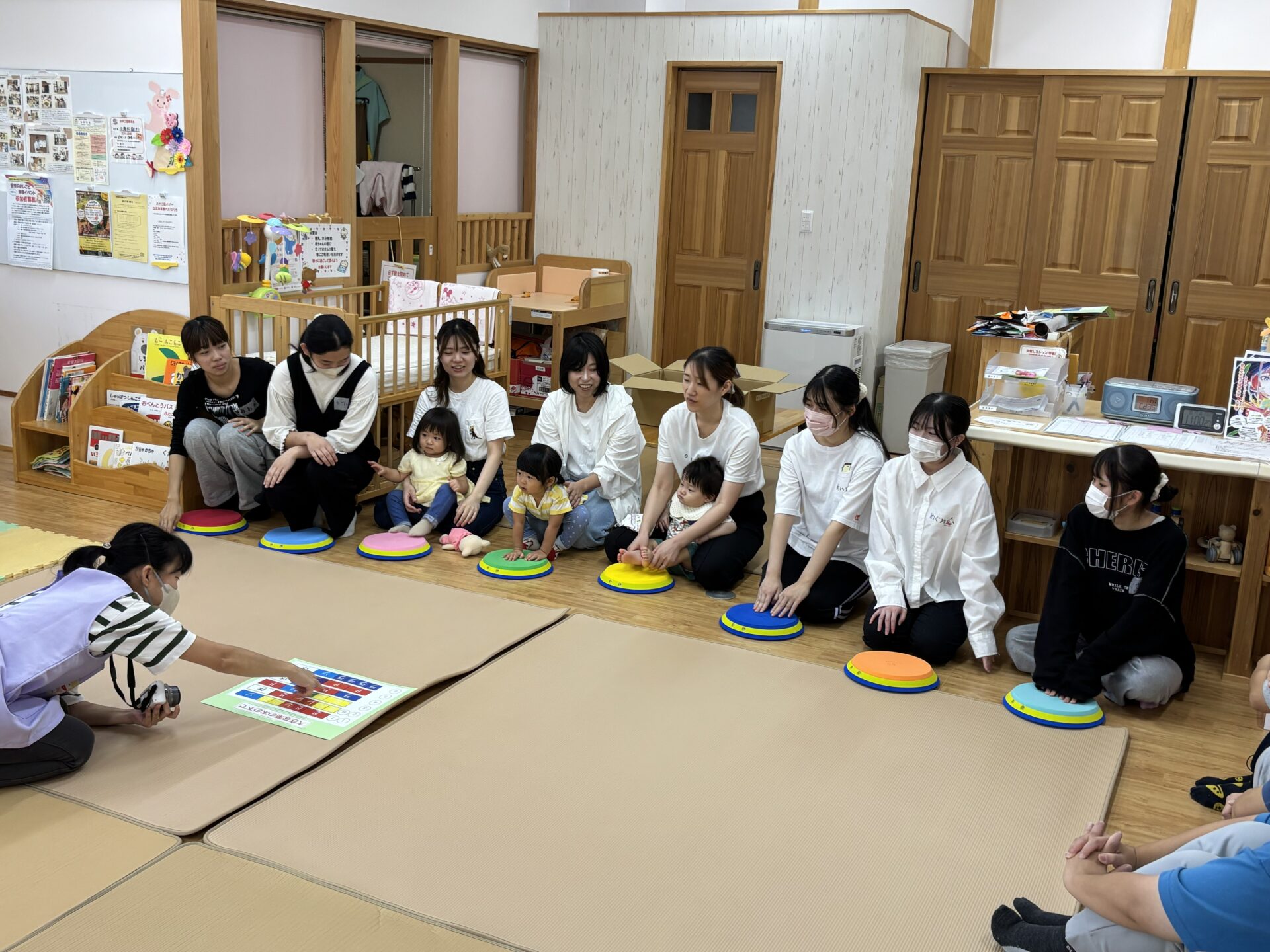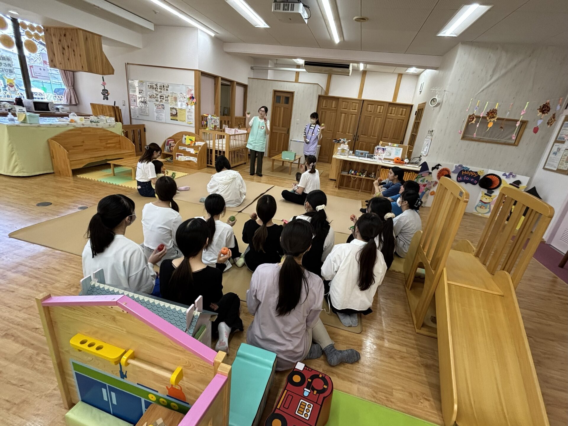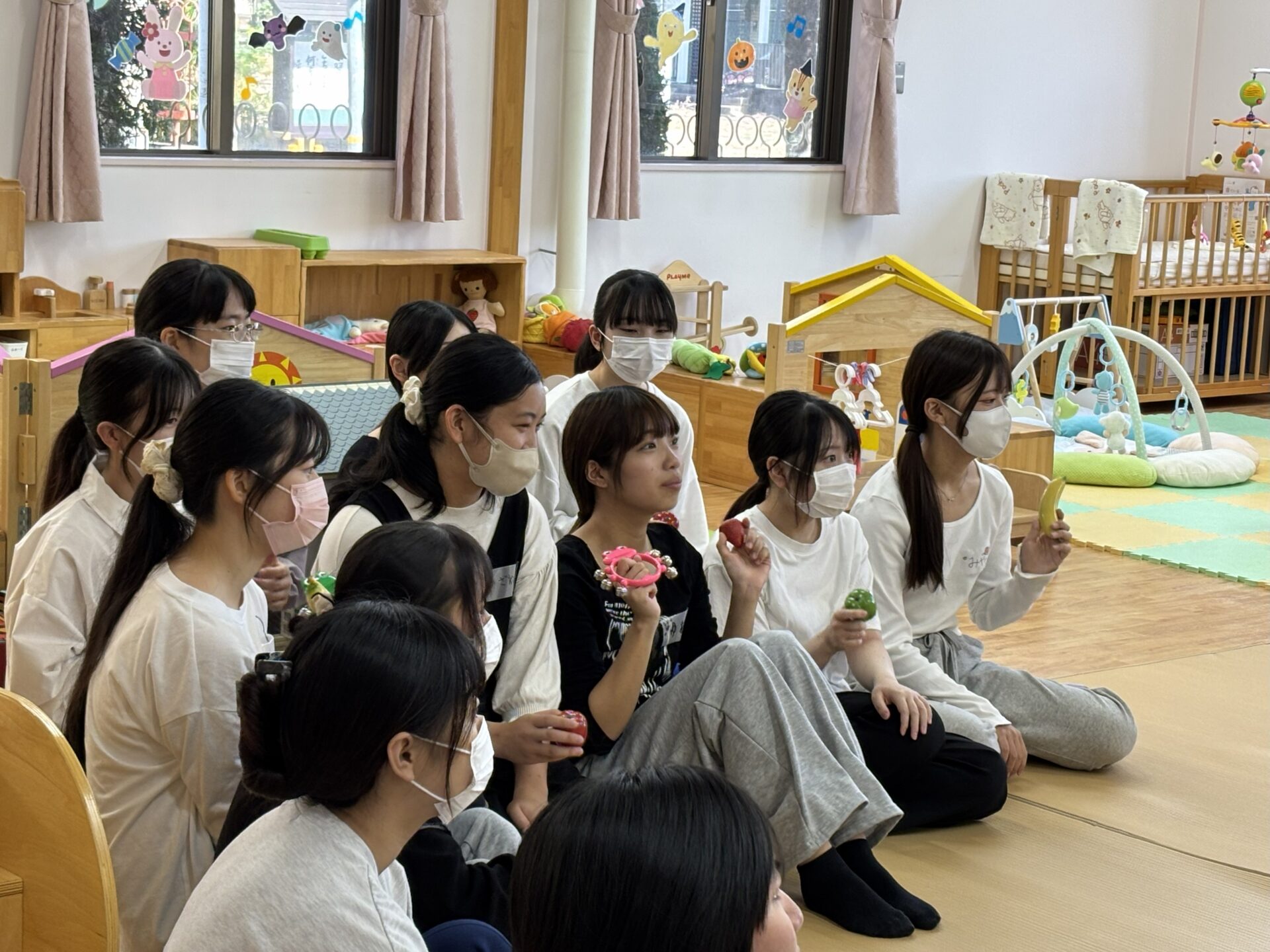 保育園栄養士を目指す学生も多い、食物栄養専攻の学生たちが、「保育学」の授業の一環で「文教おやこ園」を初めて訪問し、フルーツのマラカスや鈴、そして踏んだり手で押したりすると音が出るカラフルなミュージックパッドを使って、ちびっこたちと一緒に音あそびを楽しみました。