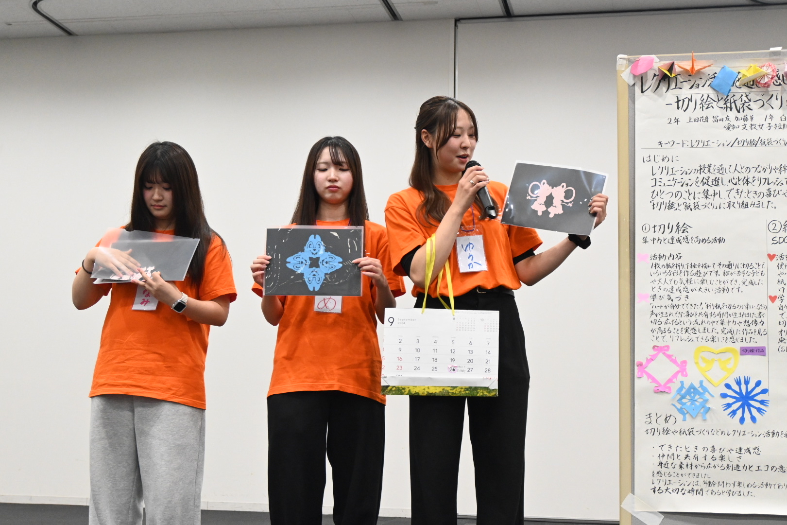 ウィンクあいちで行われた研究フォーラムでは、本学学生がレクリエーションの授業で取り組んできた「切り絵の魅力」について研究発表を行いました。「切り絵を通じて表現する楽しさ」「創作を通して広がるコミュニケーション」など、独自の視点からまとめた内容は、多くの来場者の関心を集めました。