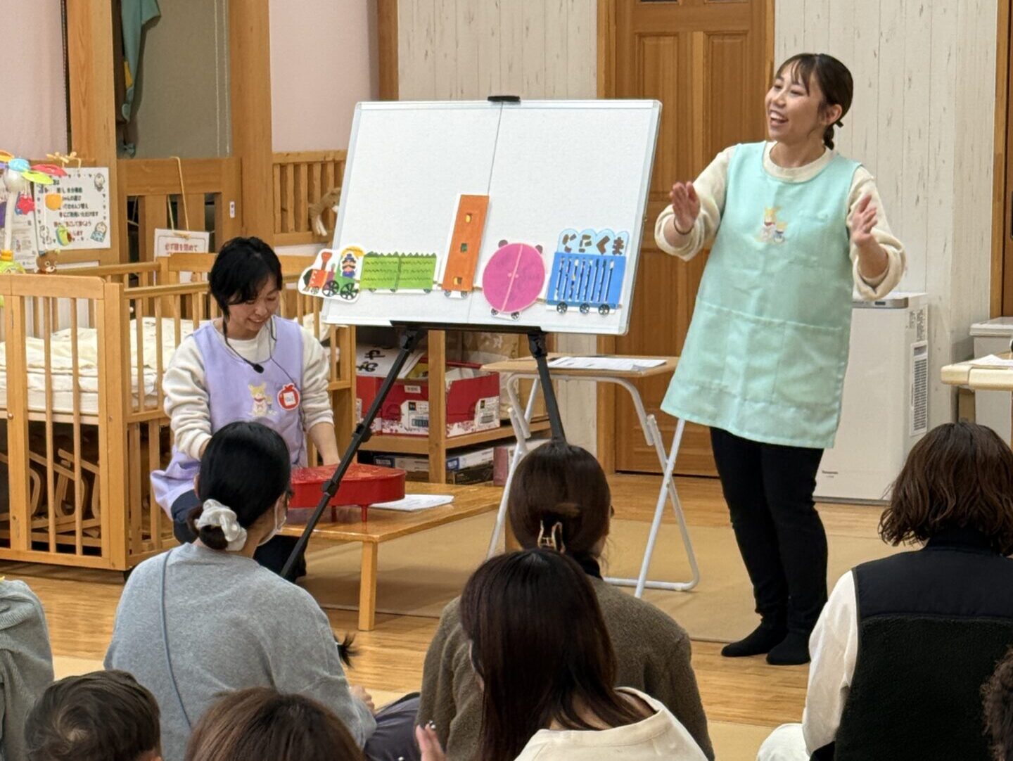 子育て支援センター「文教おやこ園」に移動し、実際に来園していた保護者・乳児の皆さんと一緒に、パネルシアターを体験しました。