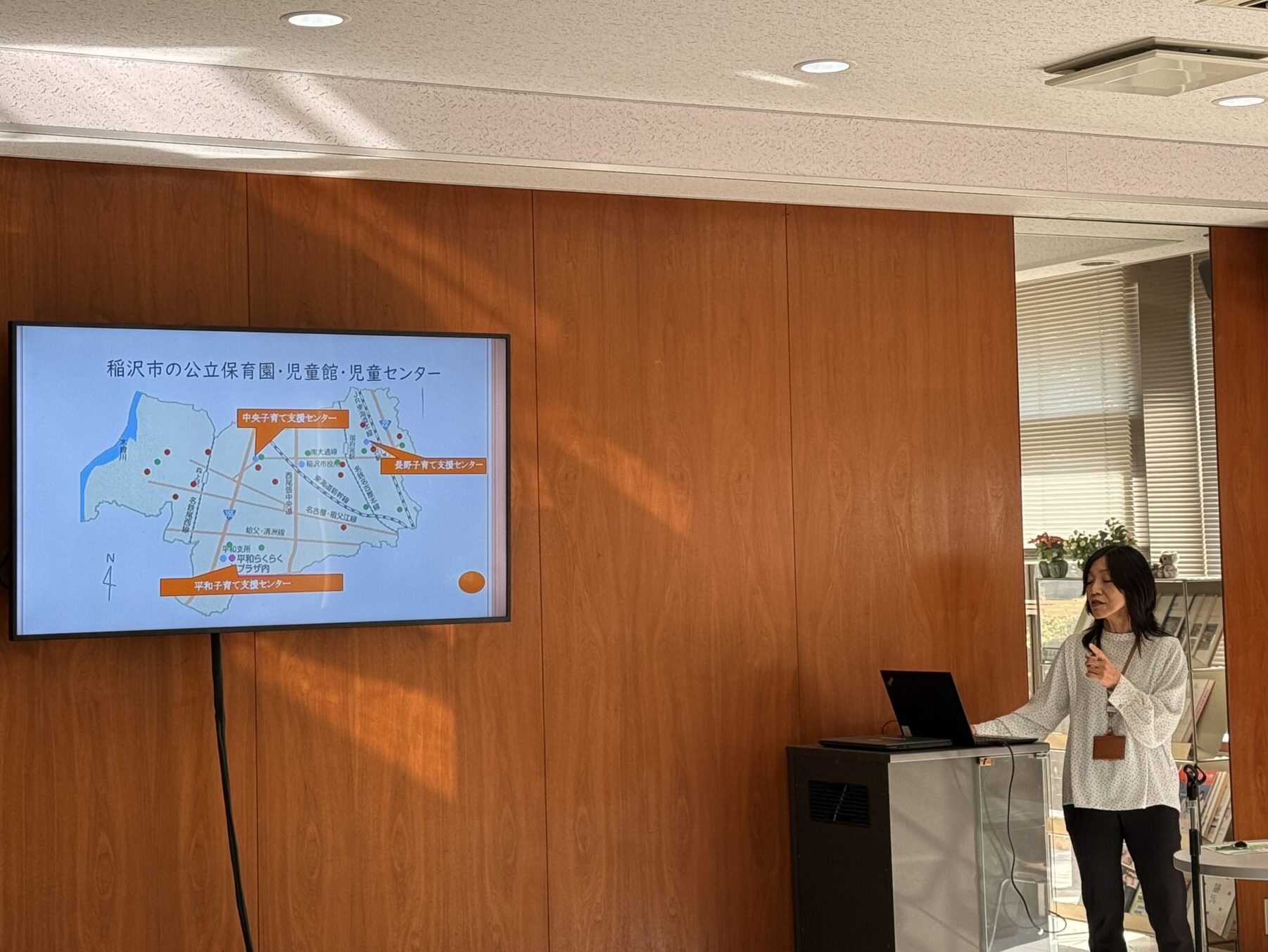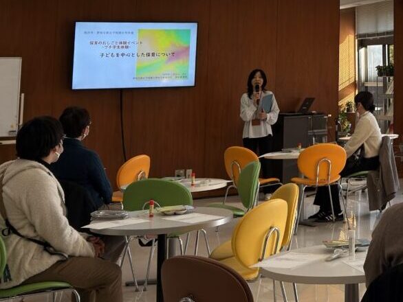 稲沢市役所保育課の職員の方を講師に迎え、最新の保育事情や働き方についての講話いただき、その後のおしゃべり会では、保育現場の疑問や不安、学びたいことなど、参加者同士・講師陣との活発な意見交換が行われました。